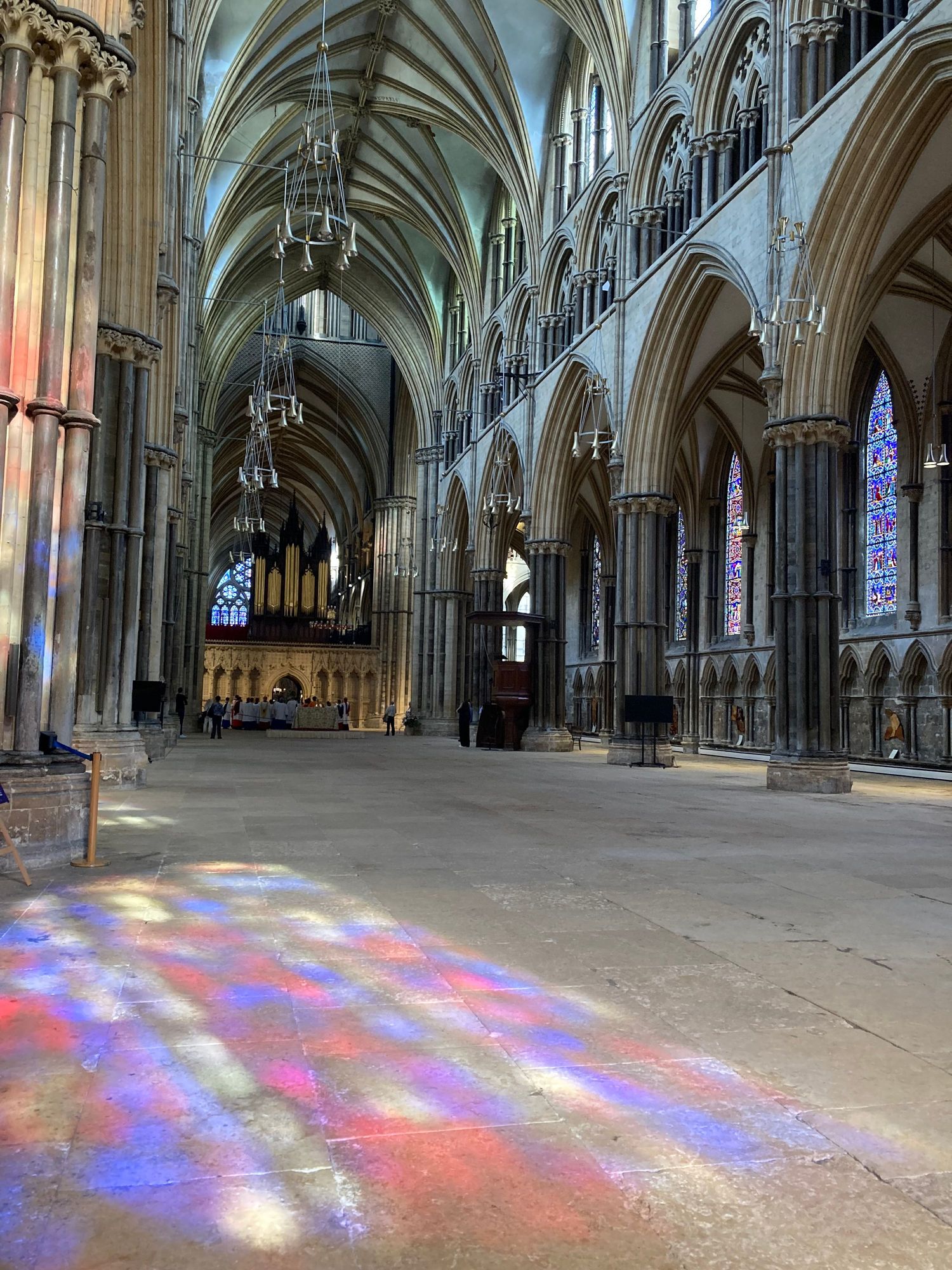 Lincoln Cathedral interior - the stained glass “reflection” on the floor was beautiful!