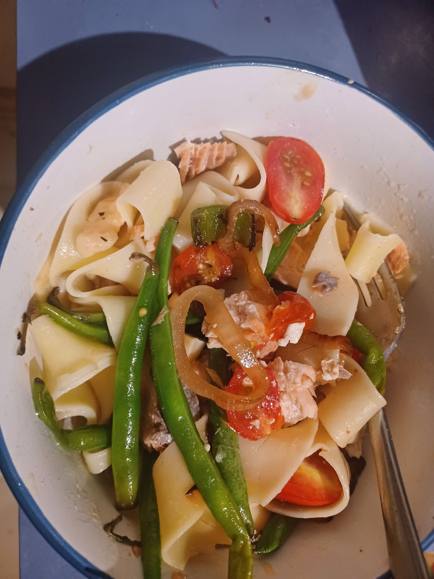 Pappardelle with sLmon filet and sauteed whole green beans and grape tomatoes