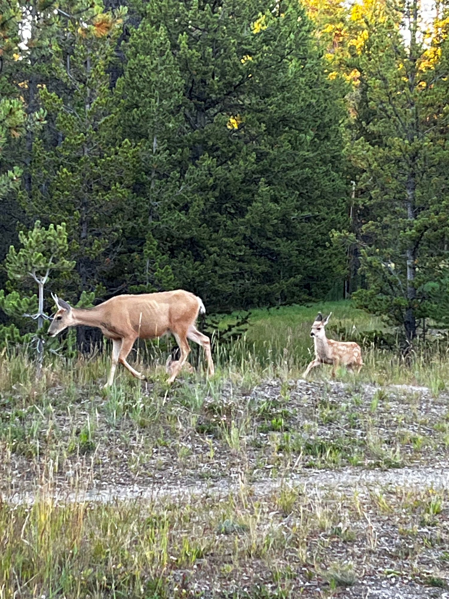 Saw a mule deer and 2 fawns in Canyon Village while walking back from dinner