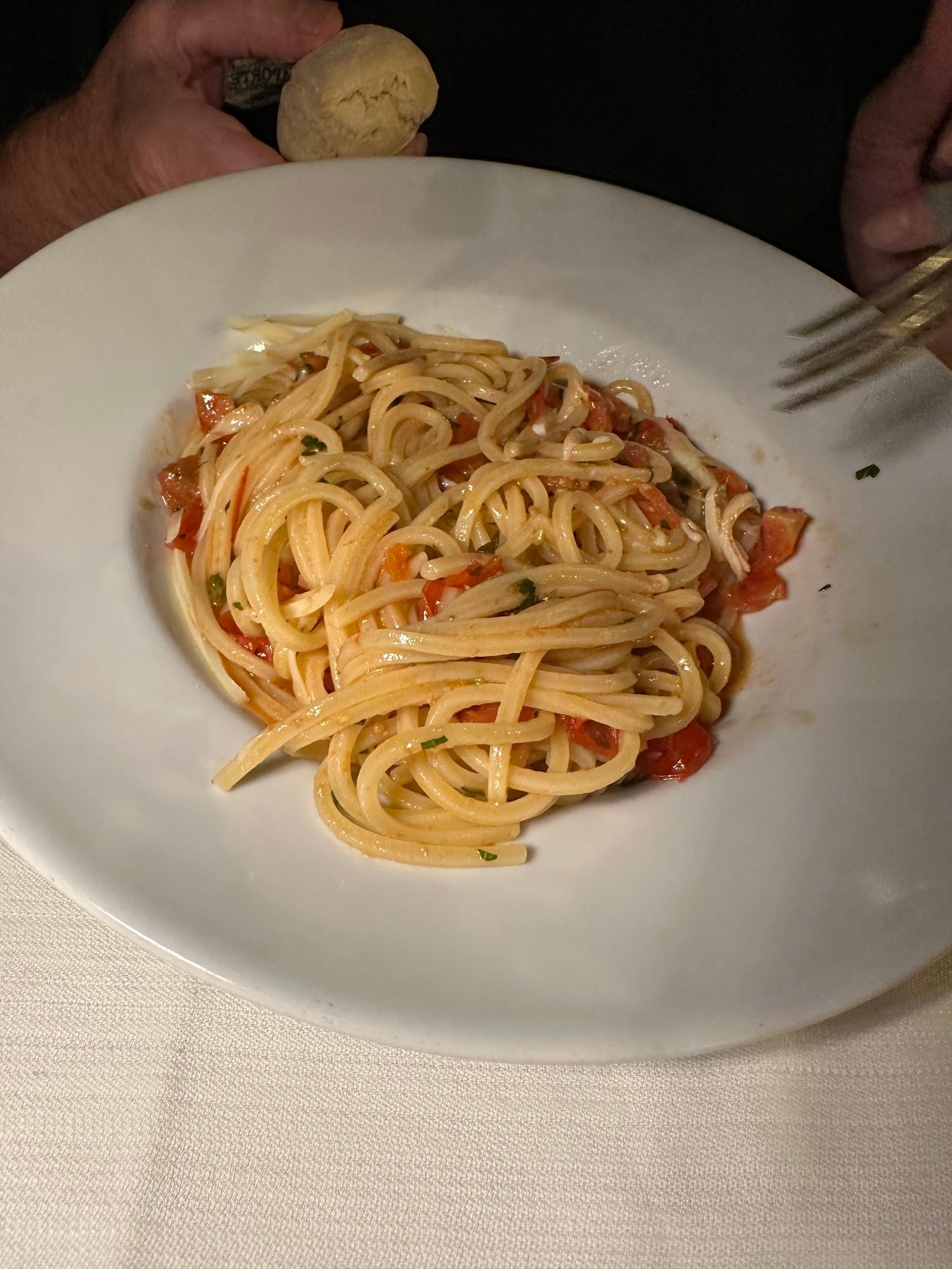 Spaghetti alle carrettiera, with Rgusana cheese, basil and diced local tomatoes. (16 euro)