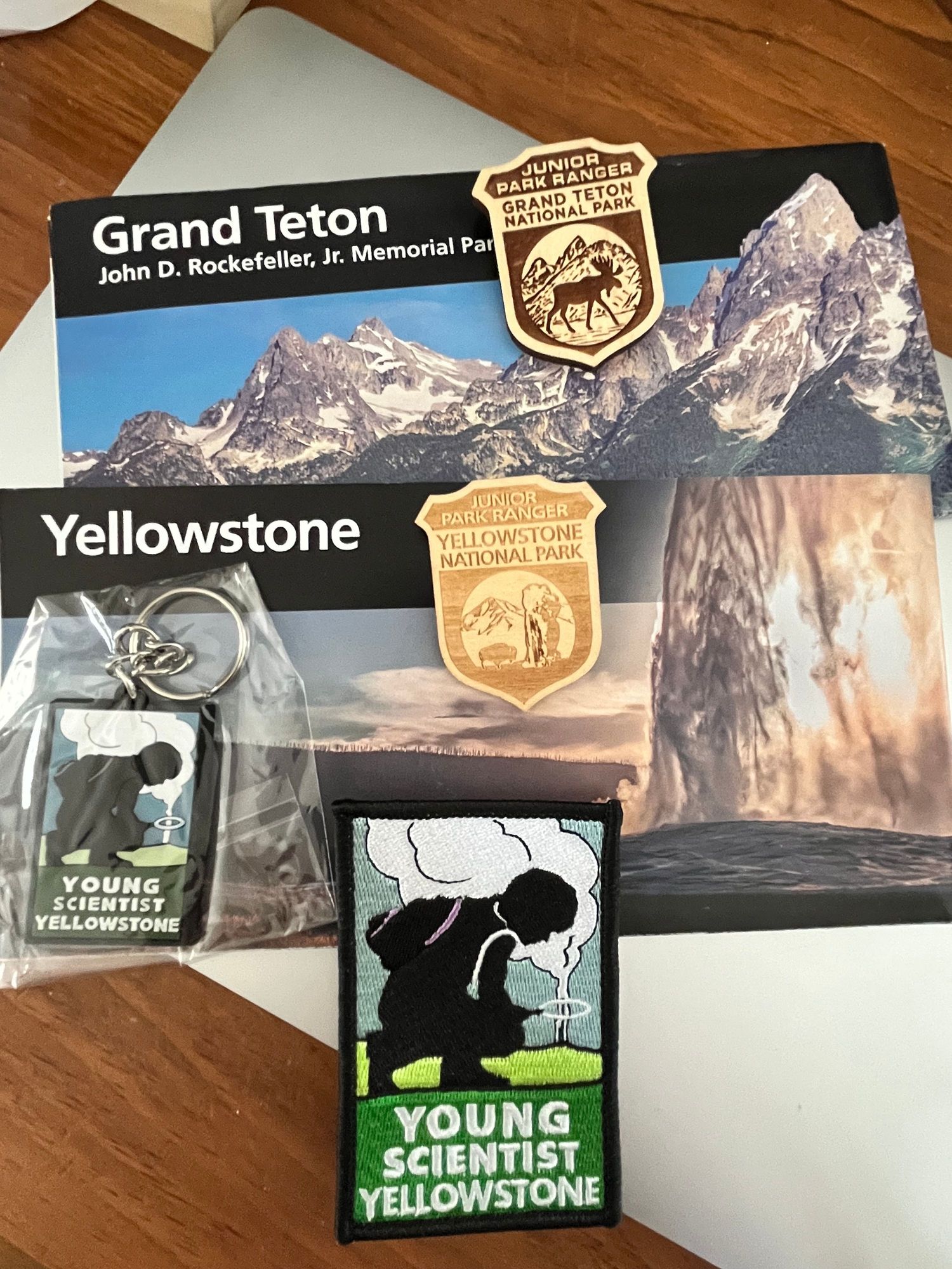 2 junior ranger badges, young scientist of Yellowstone patch and keychain