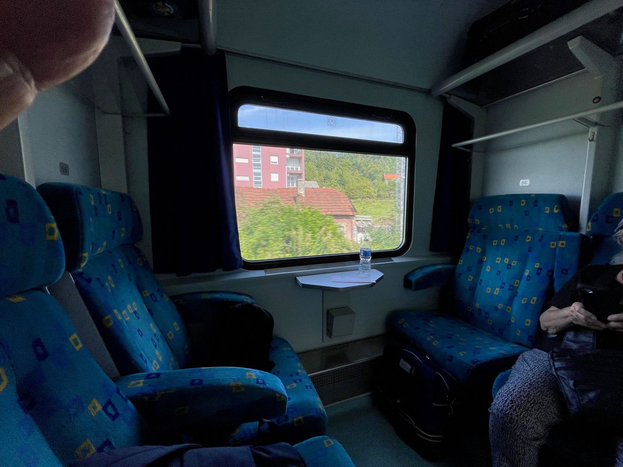 Looking out the window. There was some air conditioning and you could open the window above the picture window. Plenty of storage overhead for our bags