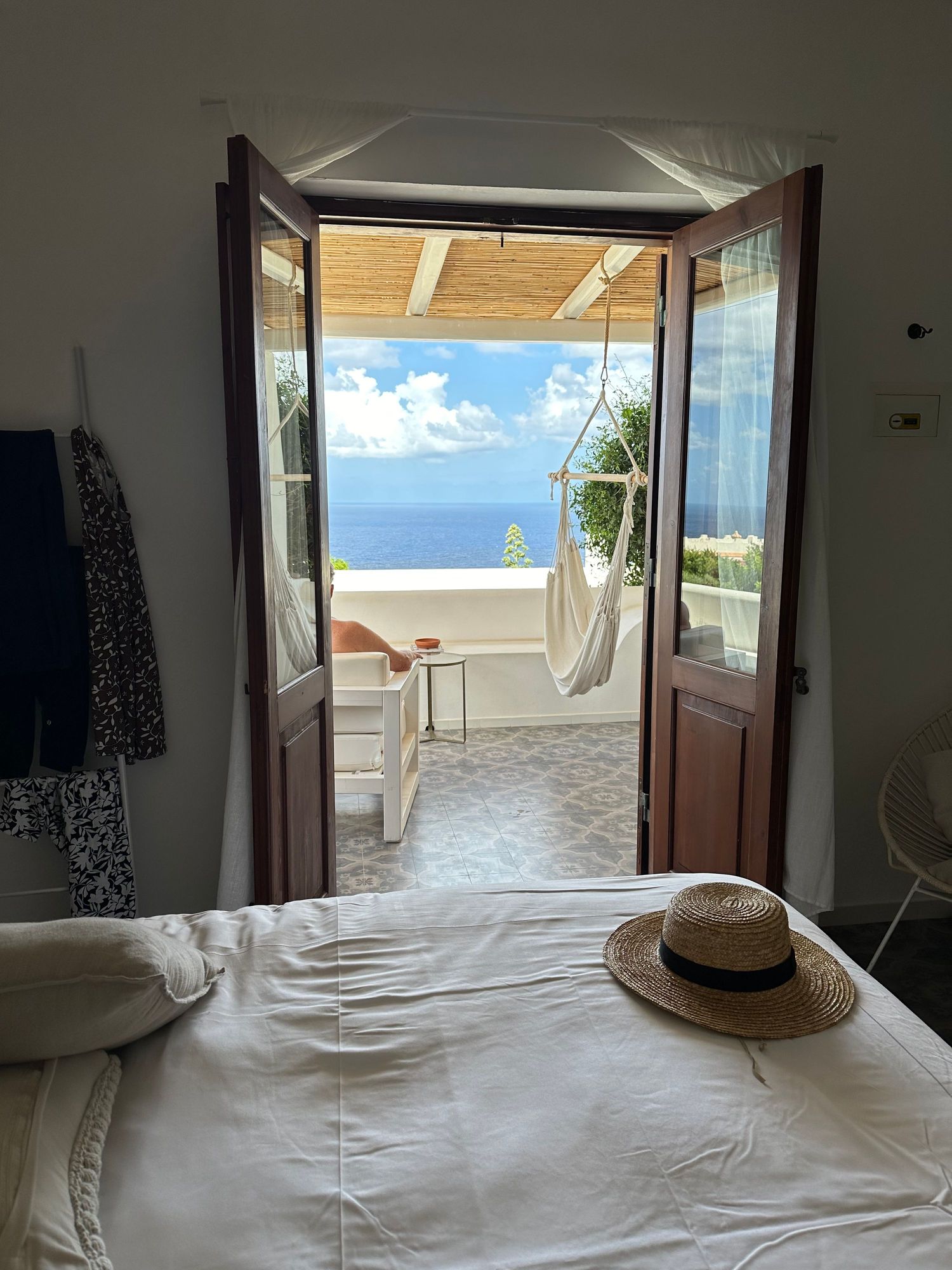 Our room, a superior double with terrace overlooking the sea. Like all the rooms, it is on the small side with bed taking up most of the space. But perfect for us! A shady terrace overlooks the sea, and the islands of Stromboli and Panarea. Terrace has one VERY comfy chair but that always seems to be occupied when I want to read there. Also a hammock which I will try later. Maybe.