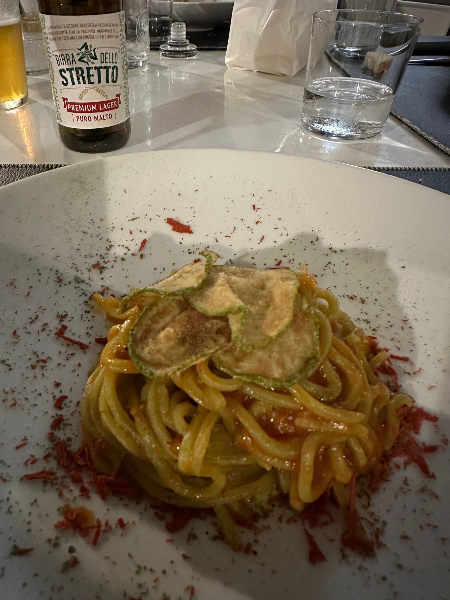 Simple ingredients together result in a smashing pasta dish: Fresh tagliolini alle carretriera with fried zucchini in razor-thin slices, and a sublime sauce made from three (!!) types of Sicilian tomatoes: Pacchino, datterino, and one more I did not catch. Good restaurants will usually note the tomato variety on their menus. We drove so many times through Pacchino last year, and during our first week spent near Marina di Ragusa. Now I very much regret stopping for seeds and information!
