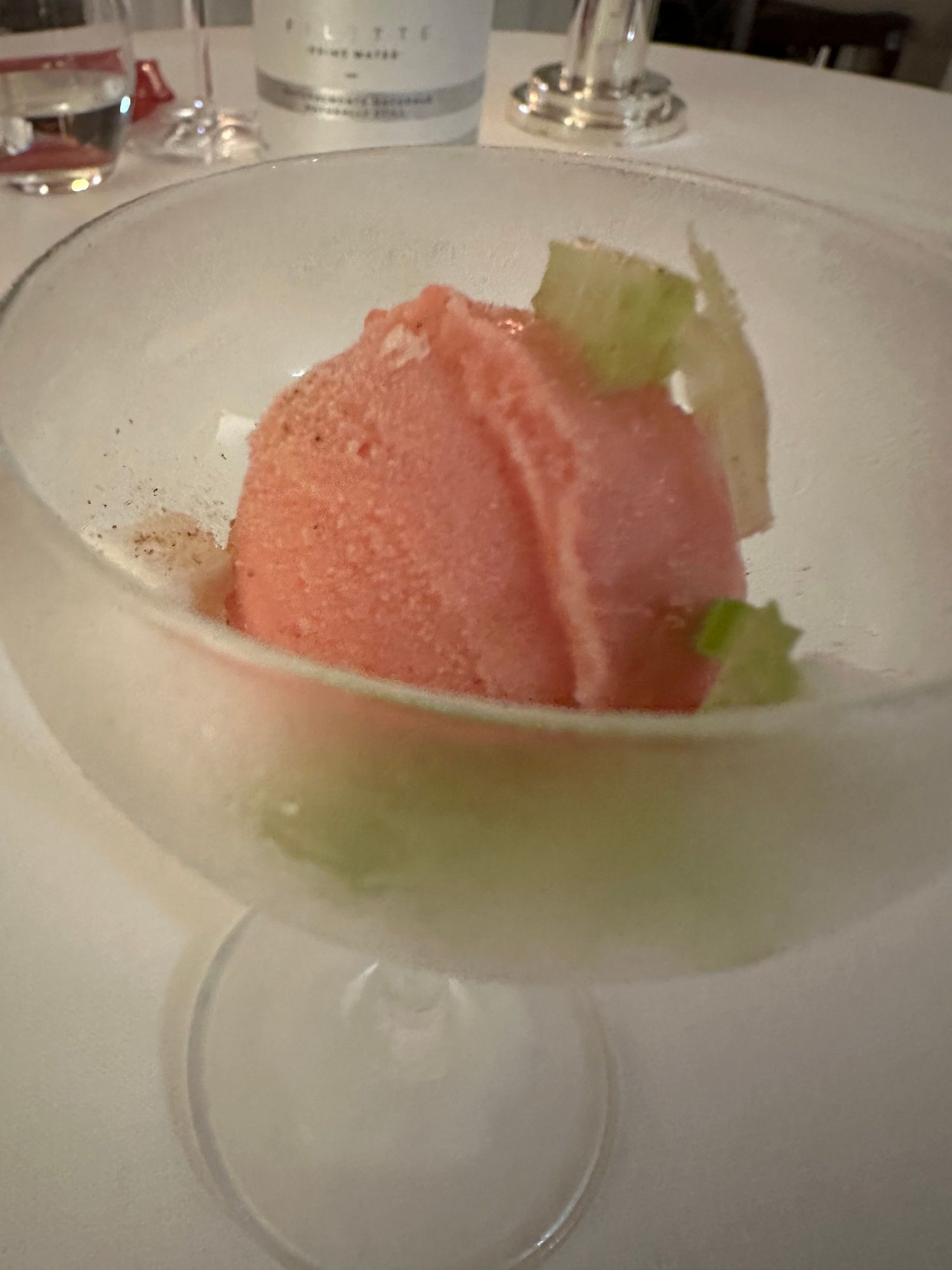 Amuse of a "Bloody Mary" sorbet, with chopped celery. Partner thought it too spicy; I thought it was ok, but a littler on the fancy side.