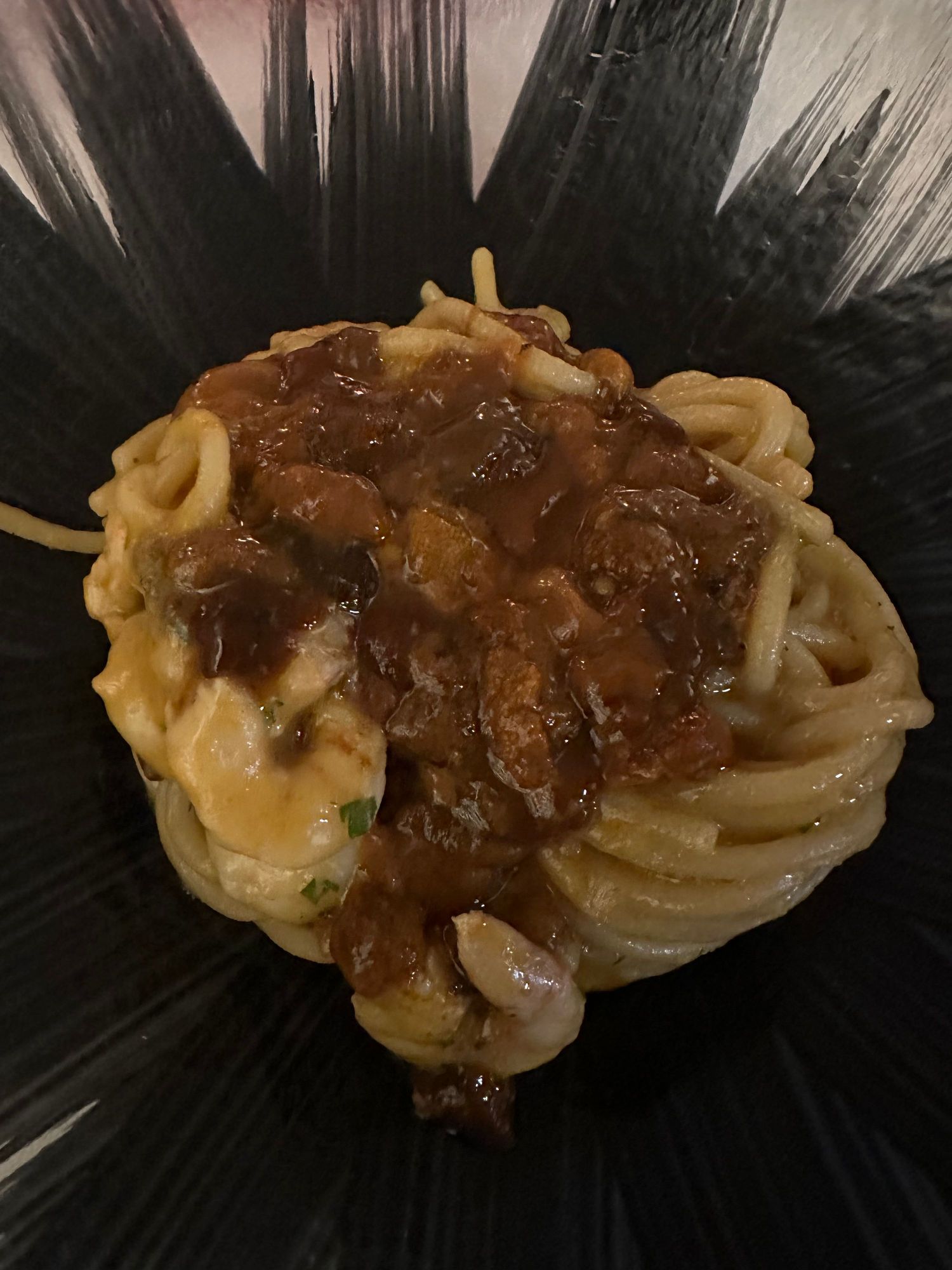 Spaghetti with small shrimp and sea urchin...one of the restaurant's classic dishes. I asked for bread crumbs on the side. Our wonderful waiter told me that asking for bread crumbs was fine, as pasta with ricci di mare is often served with them. But he said, laughing, "Bread crumbs are great, but you obviously know your Italian food.....you would be shocked at how many tourists ask for grated cheese with their seafood pasta!! (Definite faux pas, except perhaps in Sardinia)