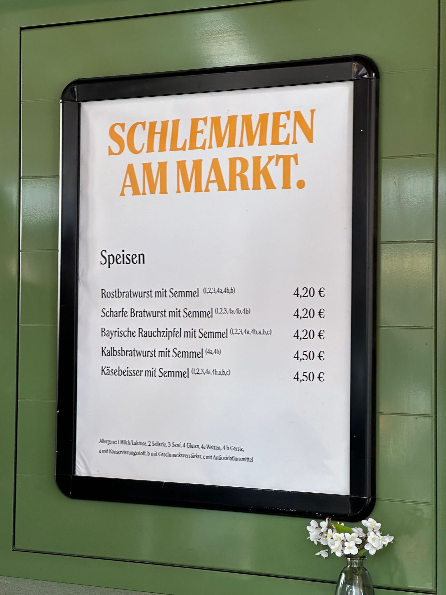 Menu of stand where I bought the wurst...the second one on the list..slightly spicy and just wonderful!!