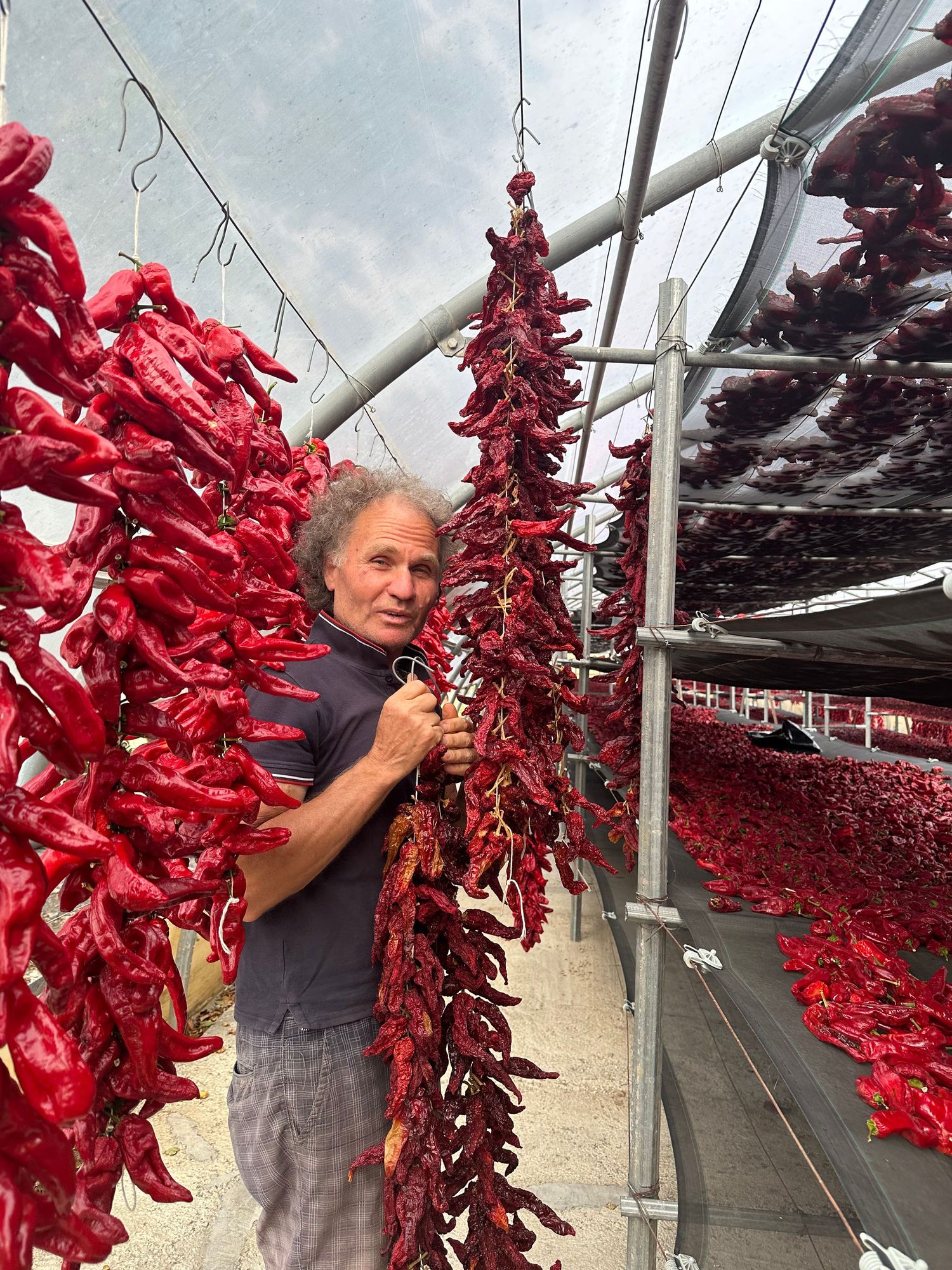 Sr. Pennella with strings of his peppers, all in various stages of drying