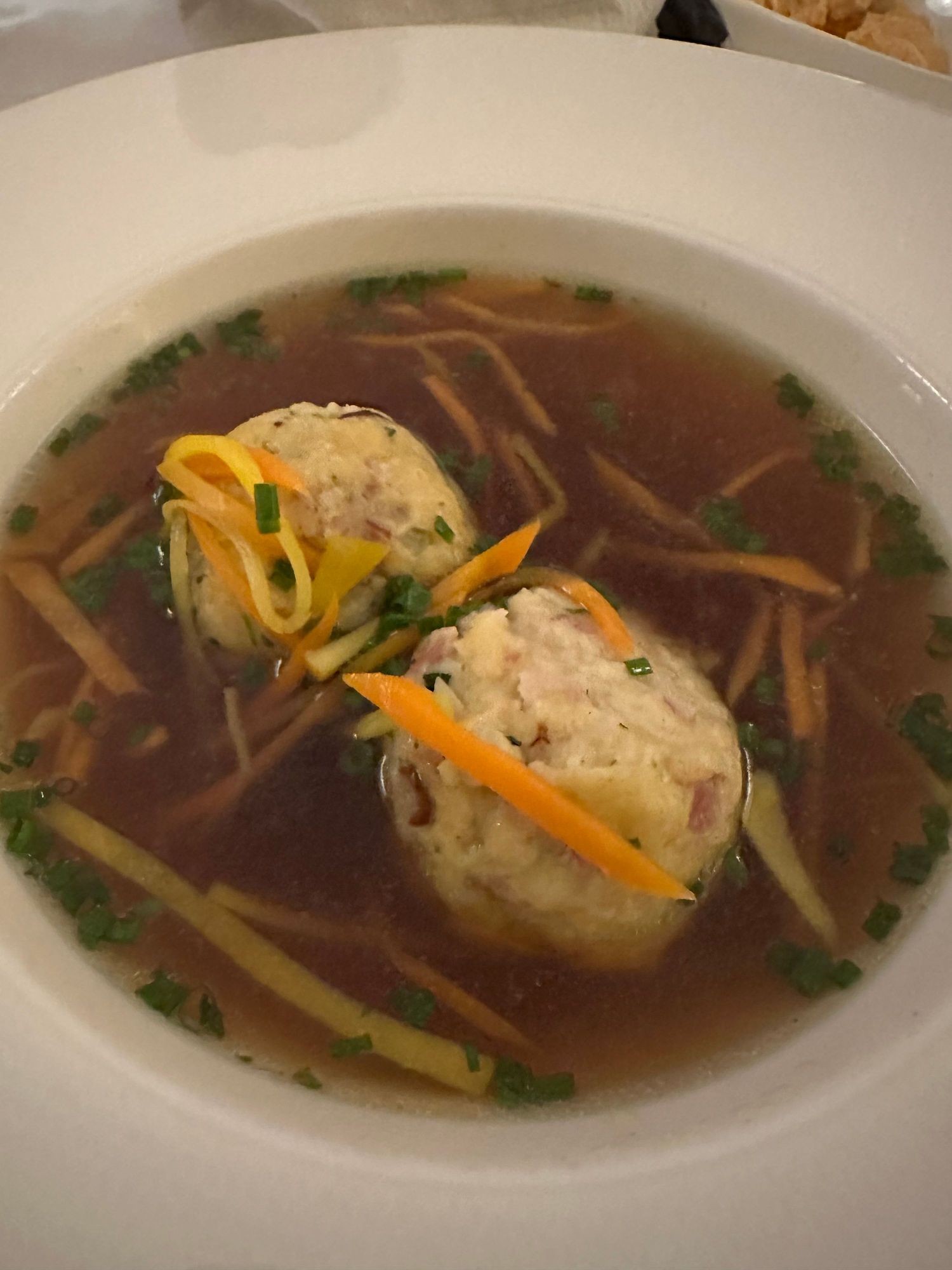 Wonderful beef consommé with what we would call "knadelin," not sure the word in proper German but it was delicious...better than the under salted consommé at WEINHAUS NEUNER.
