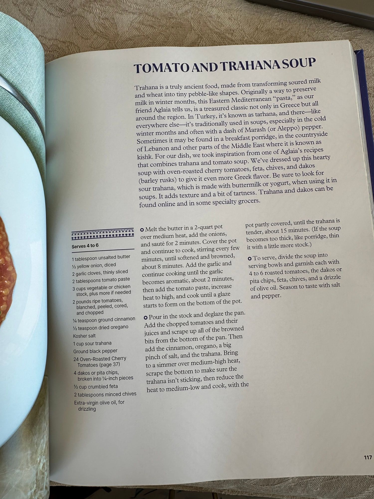 Jose Andres" tomato soup recipe..you can play with this a lot..use fregola if you do not have trahana, for example. I added plain yogurt yesterday, before I bought some feta which we will have tonight in the soup.