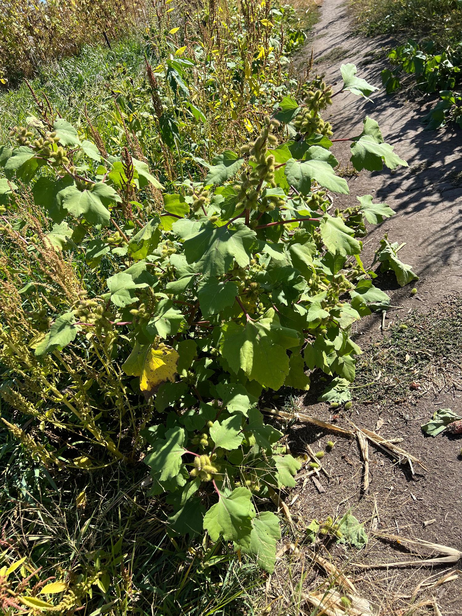 This is Burdock. this plant and cocklebur were the inspiration for the invention of velcro. Zoom in, it's sharp and nasty to try to remove from your clothes.