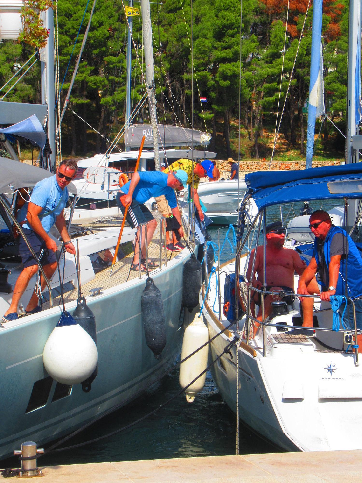 These guys are trying to parallel park. Both crews keeping an eye on there boats. This harbor is filled with boats.