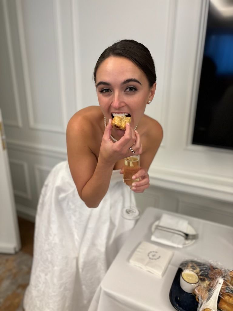 We insisted on cocktail franks even though the caterer thought we were joking. They gave the bride and groom a few minutes to try all the apps before the cocktail party. We also had espresso martinis with the dessert. My idea and the caterer is now adding it to the menu choices…