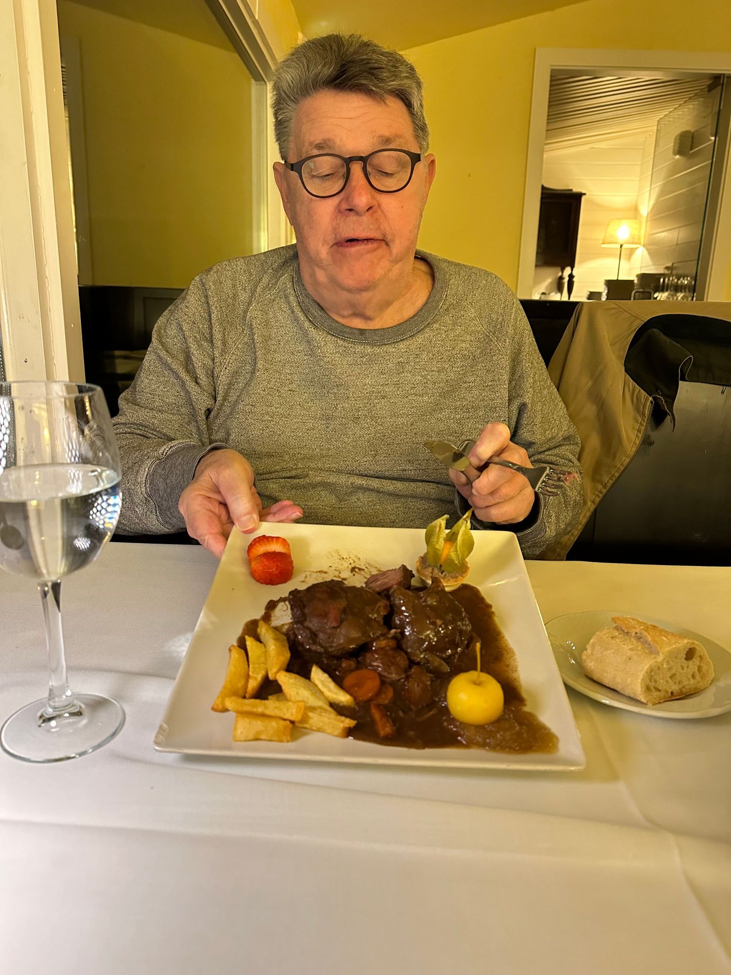 Perplexed diner eyeing his glazed pork cheeks, which he liked very much.