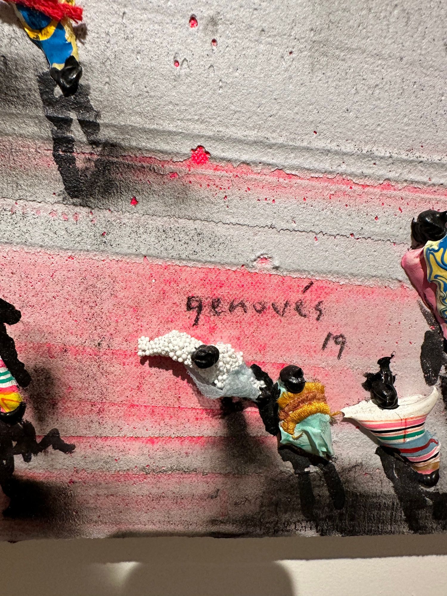 These figures are three-dimensional; crafted of paint, cloth and bits and bobs of unexpected materials; I spent a half-hour looking at this and the other, round, work of his, above....peering close-up and looking from a few feet away.....loved this!