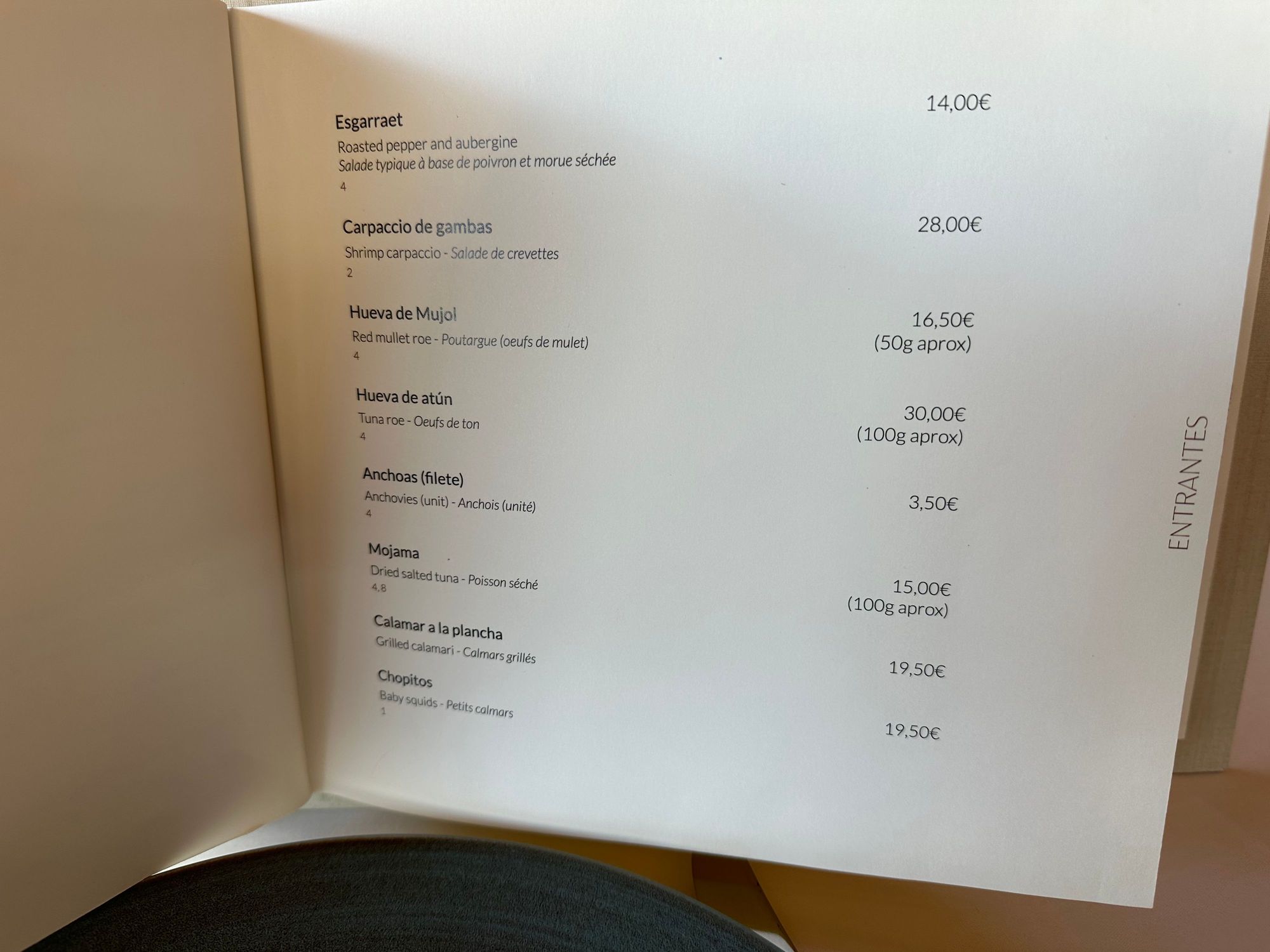 Cold starters, among them the esgarret, typical "salad" of Spain's eastern coast. Two types of peppers, eggplant, and bits of bacalao drenched in fruity olive oil from near Murcia. Fantastic!!! Fantastic!!!!
