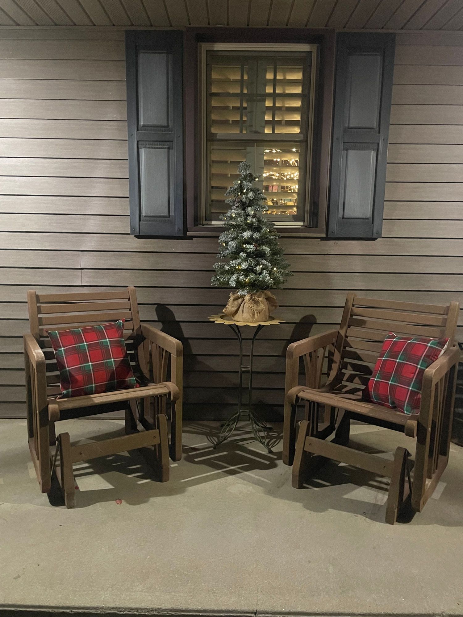 My side porch. Only Christmas stuff I’ve bought this year were these pillows. $5 each, Walmart—-and perfect I think.