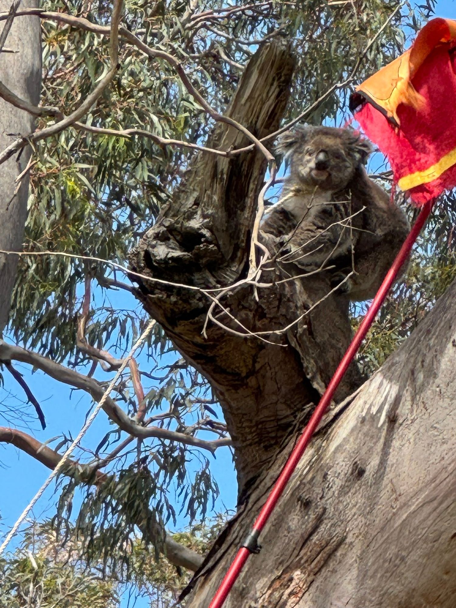 Staff at the Koala Conservation Center trying to coax the koala down from the tree so they can give her the annual physical exam