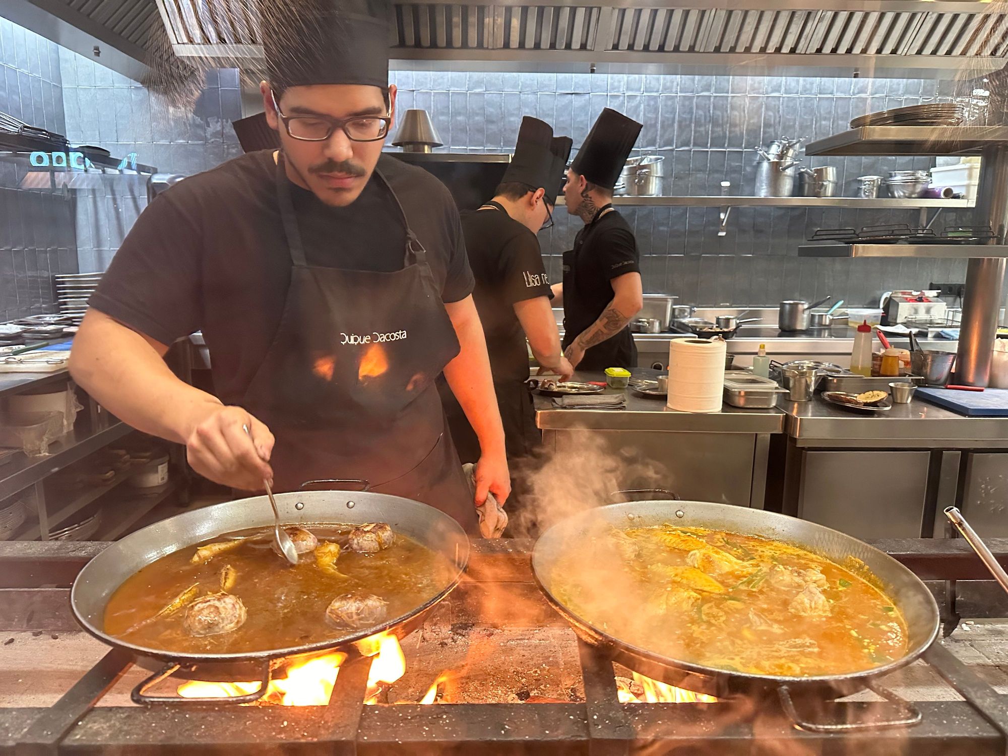 Cooking the rice over orange wood at Llisa Negra, Chef Quique Dacosta's Valencian rice temple
