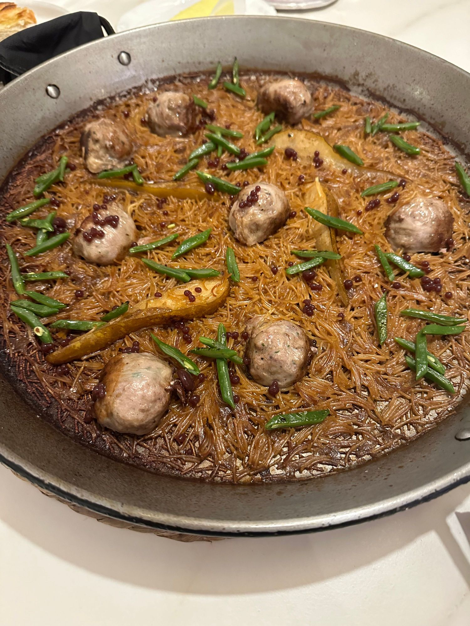 T he star of the evening's show: Fideua with figatell (a local take on a meatball, wrapped in caul fat); duck, green beans, and pears..sublime!!!