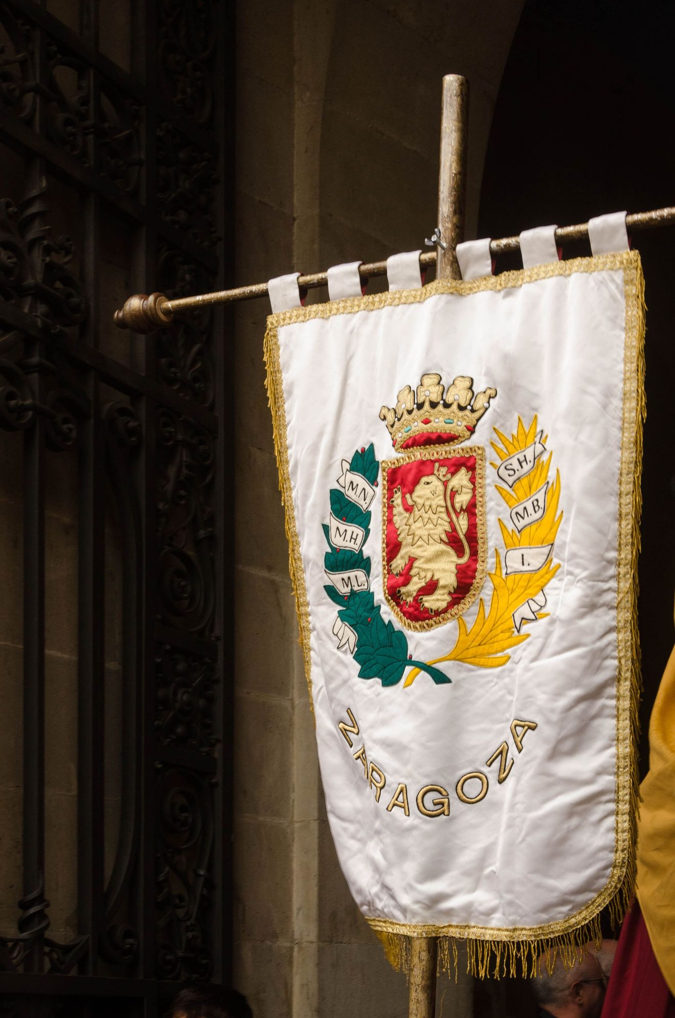 As with other festive events, banners representing barrios (or in this case another town) were part of the show. The gegants that they lead about represent various historical figures.