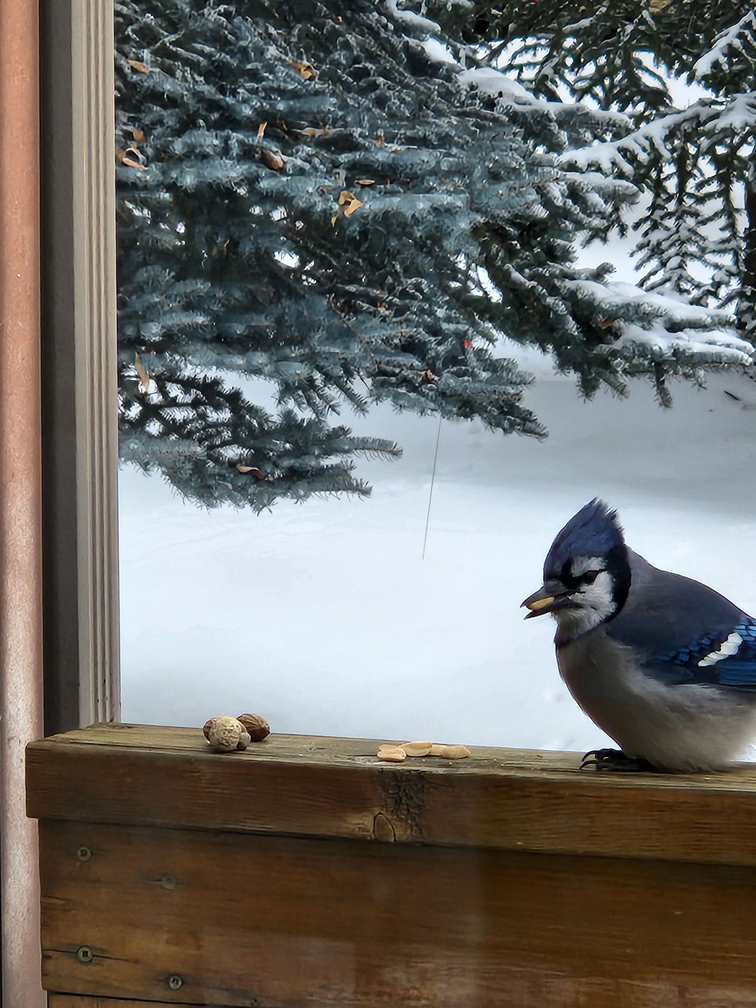 Hiding extra peanuts in the tree I think he sees me through the window !!