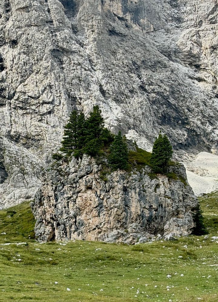 Walking around the base of the Sassolungo. We were fascinated by the small rocks with trees growing out of them.