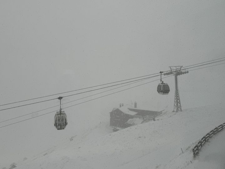 There’s a long, 4-kilometer gondola ride (12 minutes) to the top of the Kronplatz—elevation 2,275 meters (about 7,500 feet). The man selling tickets at the lower station casually said, “You know it’s snowing at the top of the mountain, right?” That became evident about halfway up.