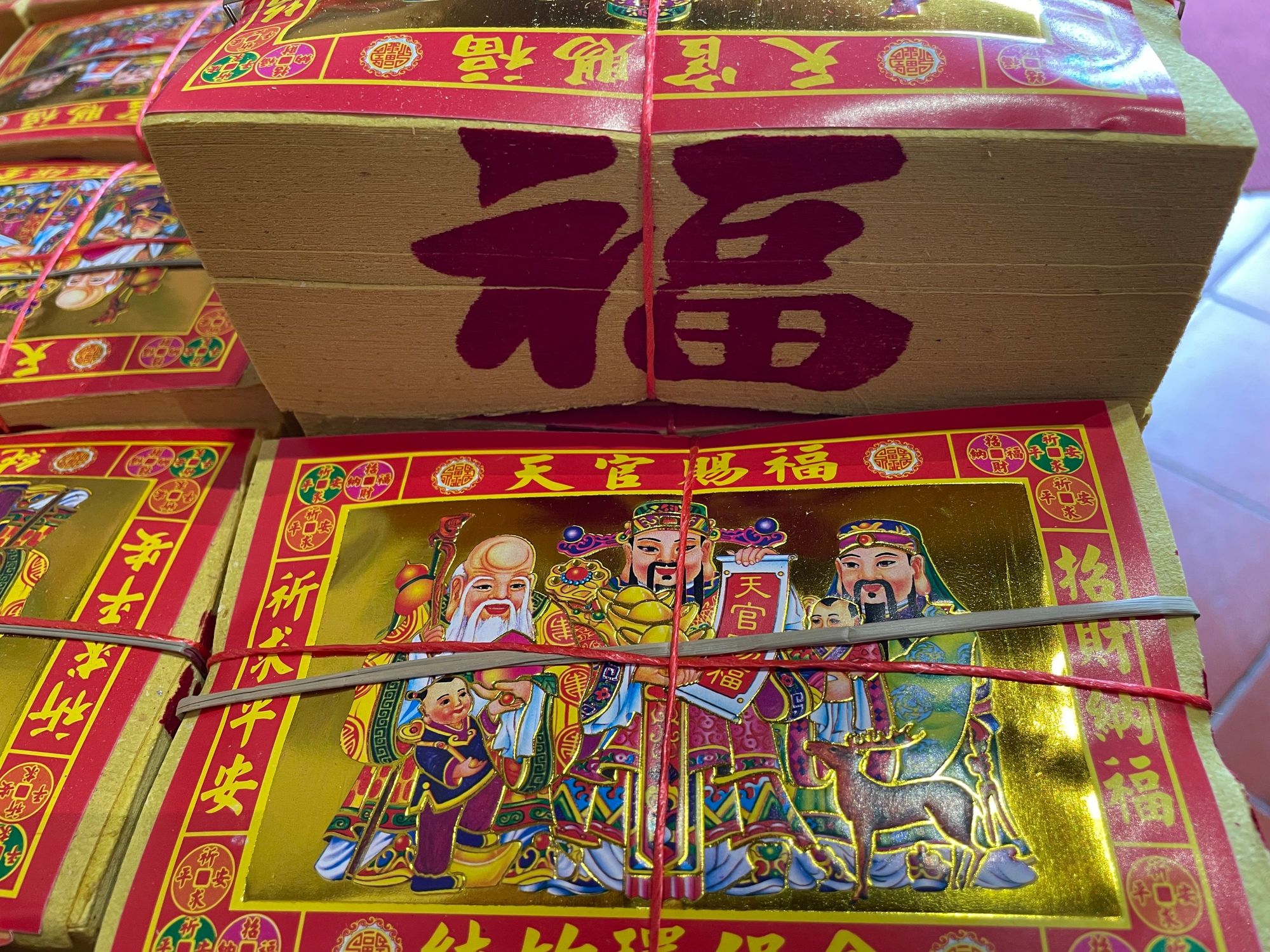 Joss money - people buy this and then burn the "money" as an offering to the gods