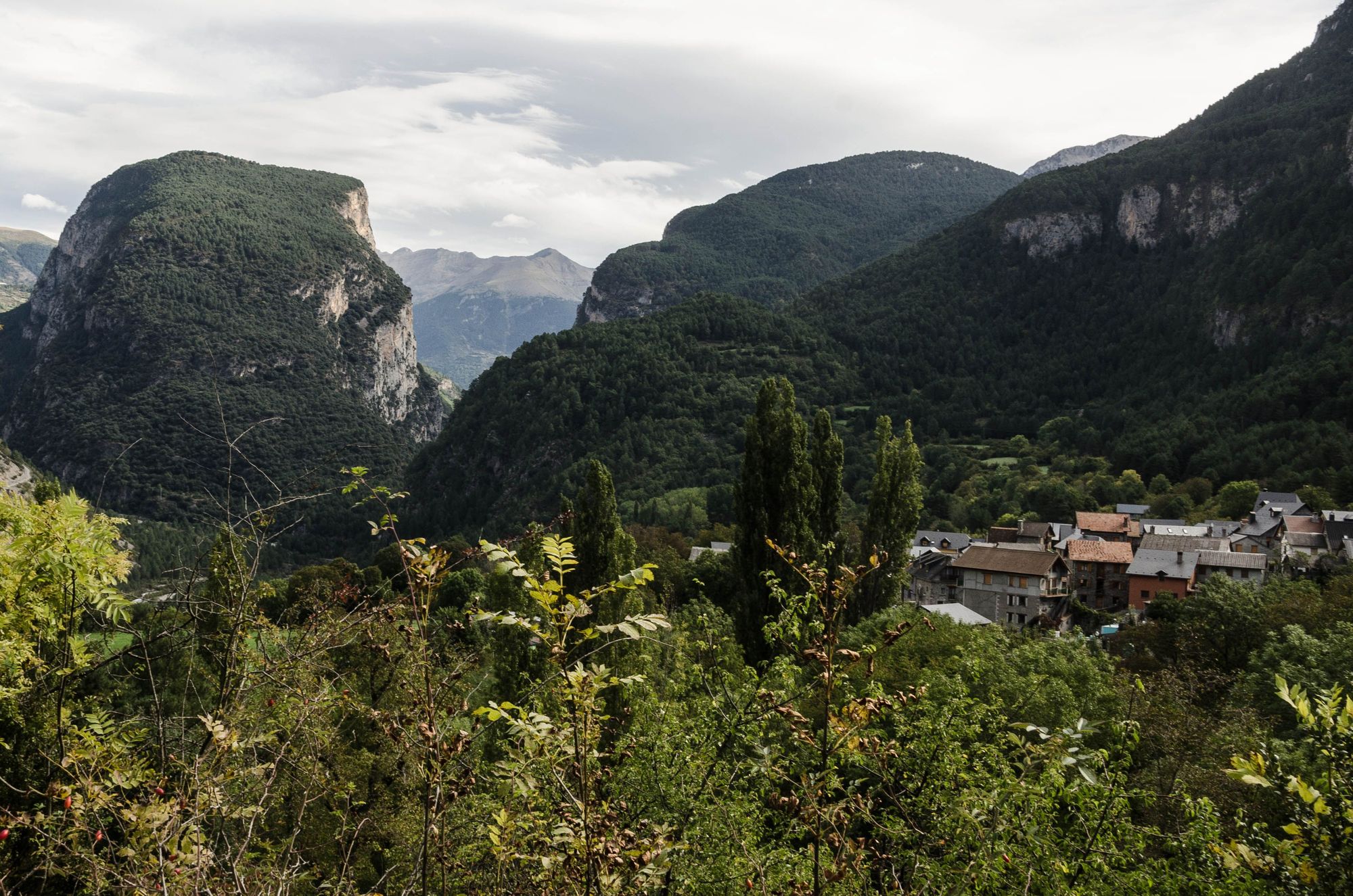 We headed north past Solomonte's Escalona HQ up the vale di Christau. The lovely aquamarine Cinca river was right beside. We passed the now-blocked shortcut to the lake, a route ruined by recent flooding. Then we went through the ex-hydro town Lafortunada and the Desfiladero des Devotas. A waterfall streamed atop us in the tunnel there. A historic pilgrim woman came from afar to worship there, hence the name. On the way up to Ibon de Plan we went to the village of Saravillo village (seen above).