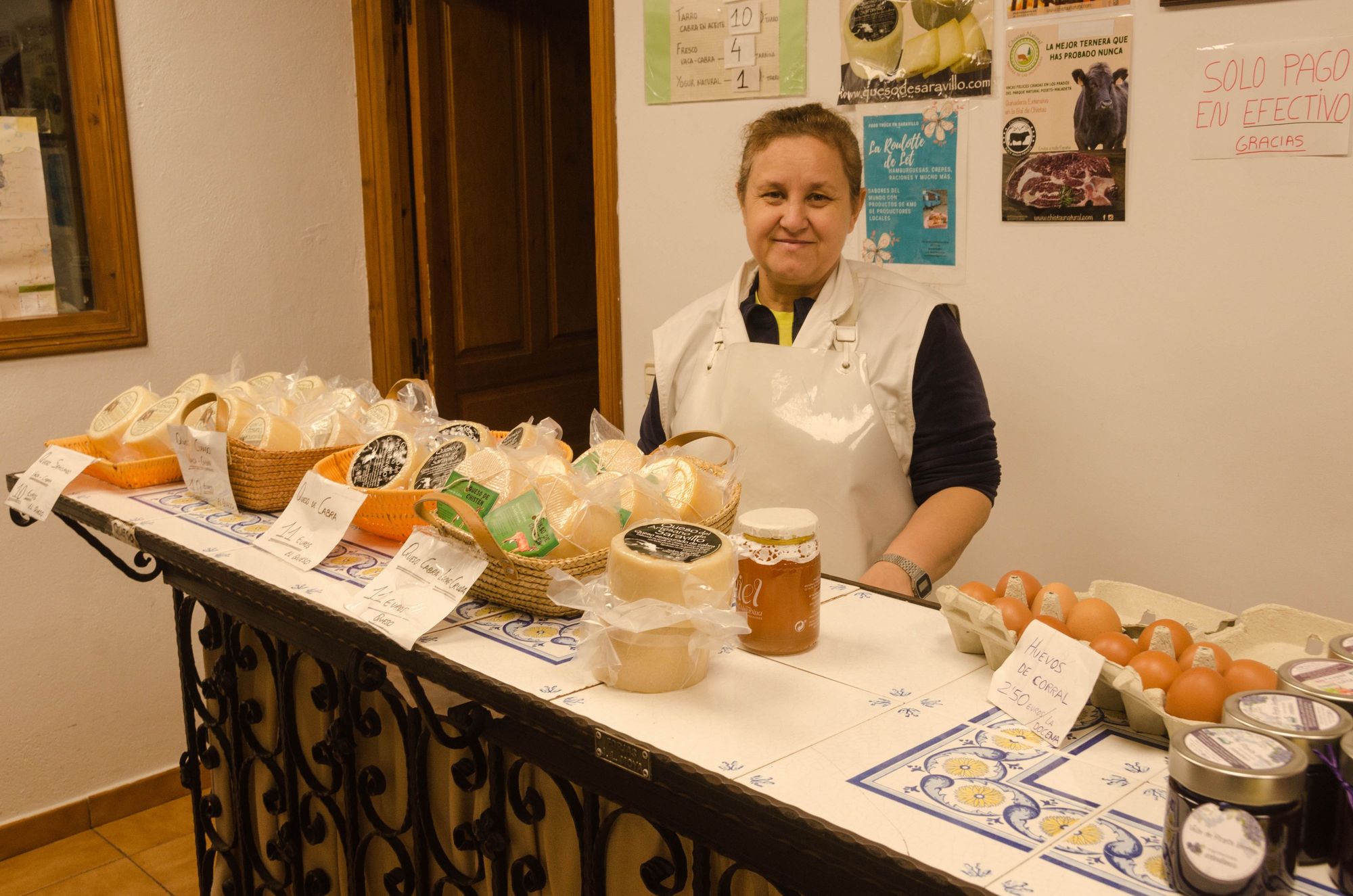 There on the outskirts, we shopped at Queso del Artesano de Saravillo. If I caught their family name correct, these folks were Andres Miro and wife (shown here). They make their own varieties of goat cheese, plus 'arandanos' or Pineta blueberry jam, honey, yogurt and eggs. We bought a wide variety. It was amusing to hear their unseen goats bleating in their nearby pen.