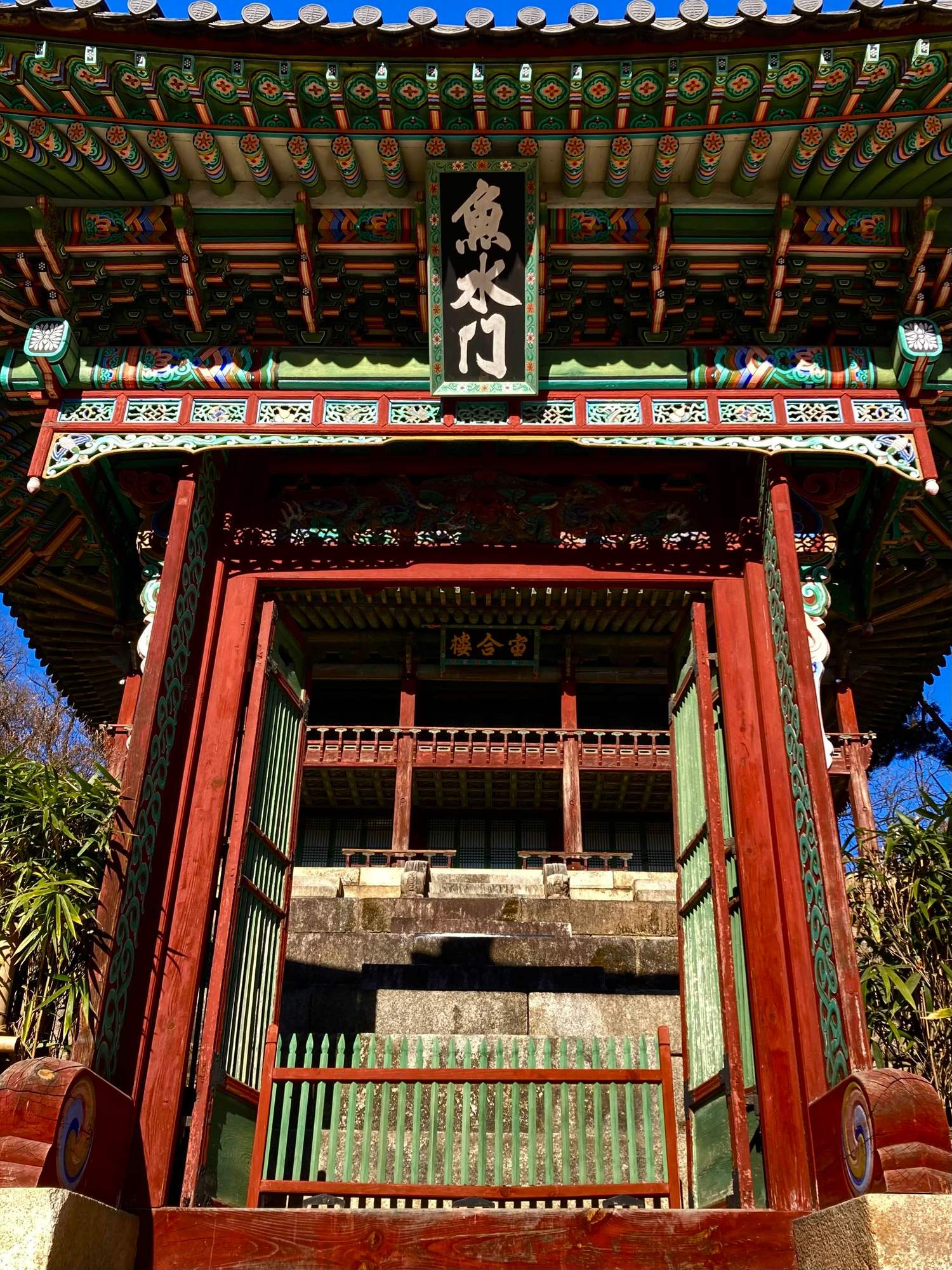 Huwon Secret Garden, Seoul: Eosumun Gate and Juhamnu Pavilion at the Buyongji part of the garden. Juhamnu Pavilion would have contained the Joseon royal library.