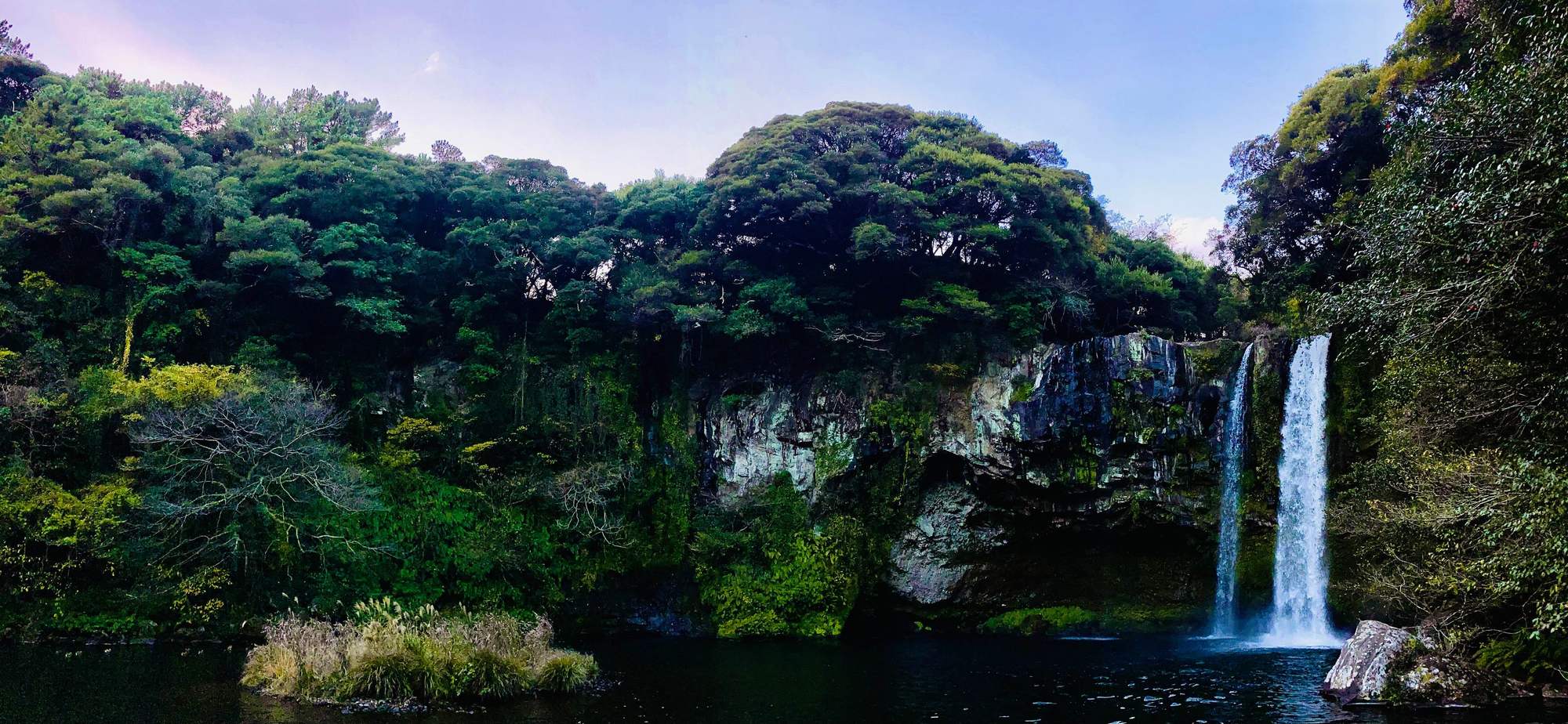 Cheonjiyeon Waterfall, Jeju: A panorama of the gorgeous falls.