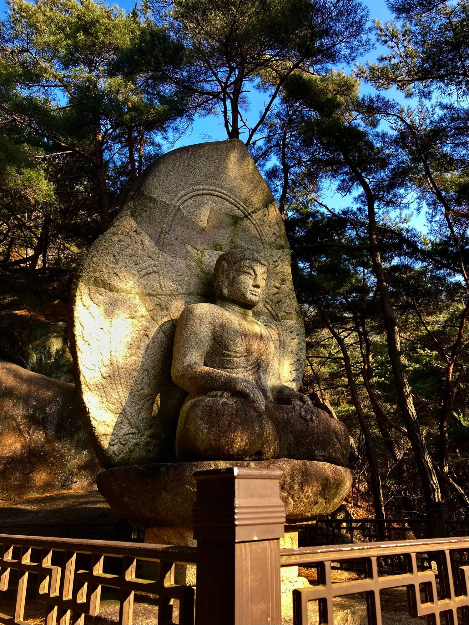 Mount Namsan (Western side), Gyeongju: The 8th century Stone Seated Buddha in Samneunggye Valley.