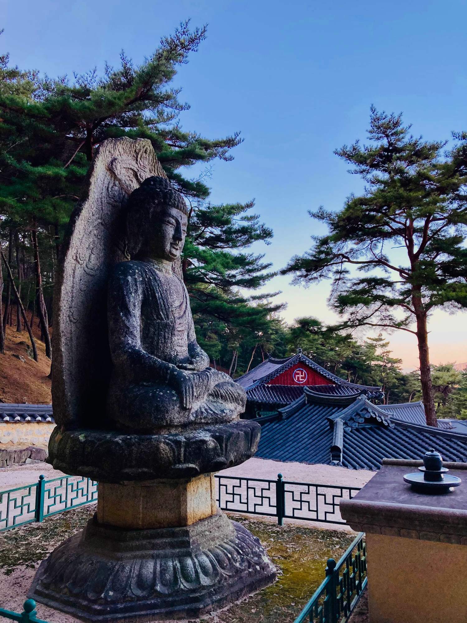 Mount Namsan (Eastern side), Gyeongju: The wonderful 8th century Stone Seated Buddha in Mireuk-gol Valley, pictured at dusk.