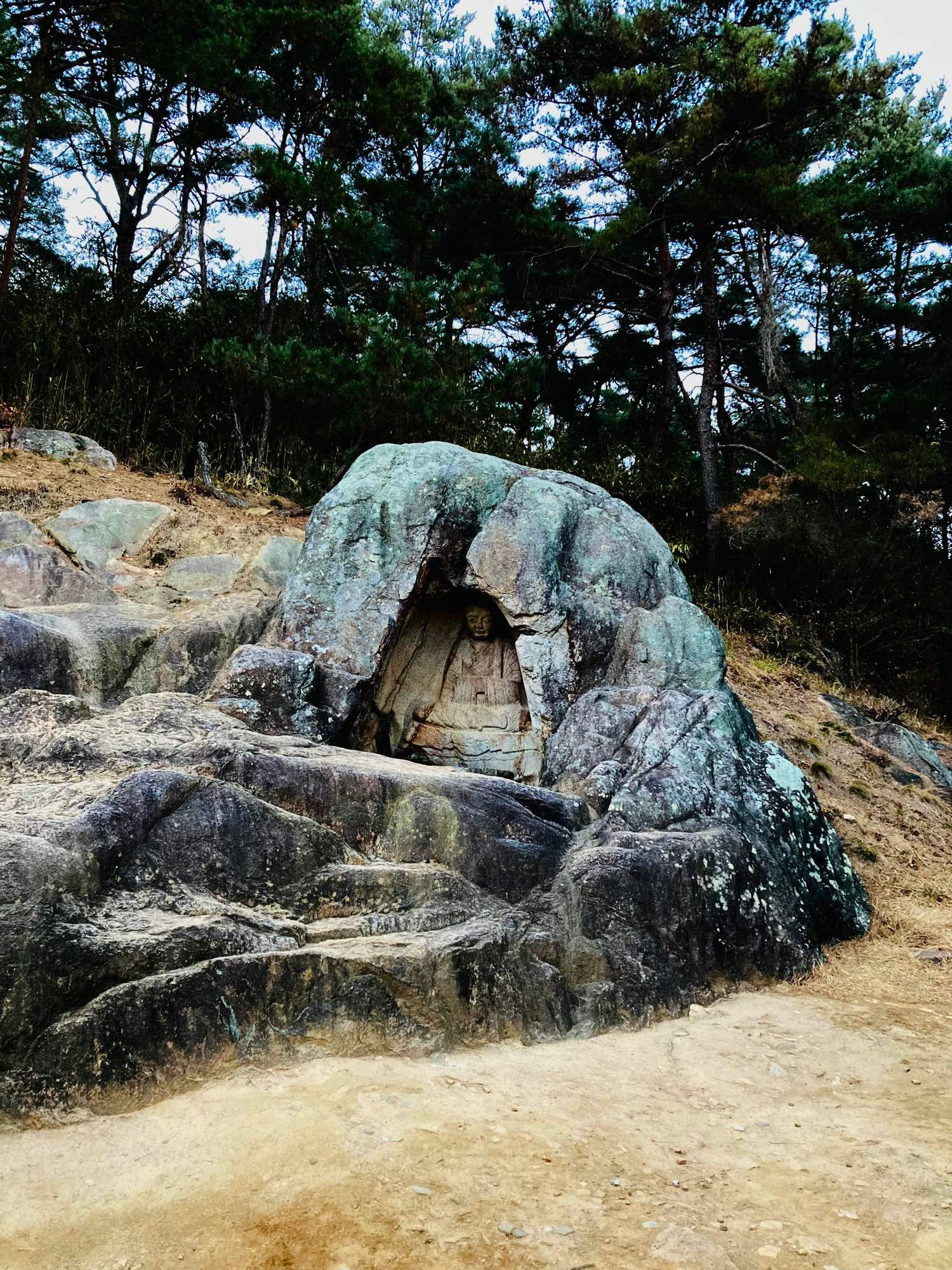 Mount Namsan (Eastern side), Gyeongju: The 7th century Rock-carved Seated Buddha in Bulgok Valley.