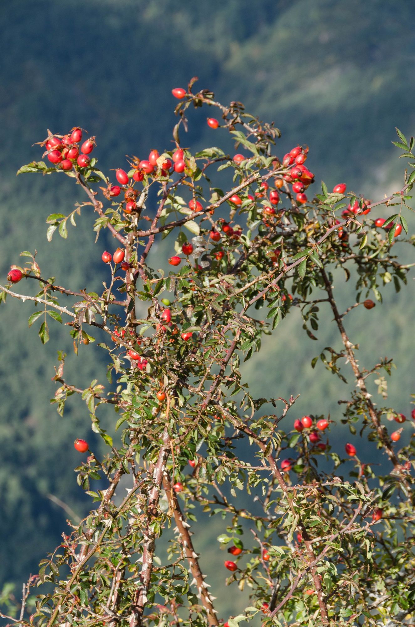 The signature berries of the Pyrenees are the 'pataculo' or damask rose. Despite being high in vitamin C, it can cause constipation (see 'culo'). Julian handed us some dried ones, already turning a yellow-orange tinge. Elsewhere: a kind of vine growing out of rockfaces used for both animal plus human abortion. We were also shown the large, light-green bush known as 'the difficult mother-in-law'! A hard, inflexible bush mind you.