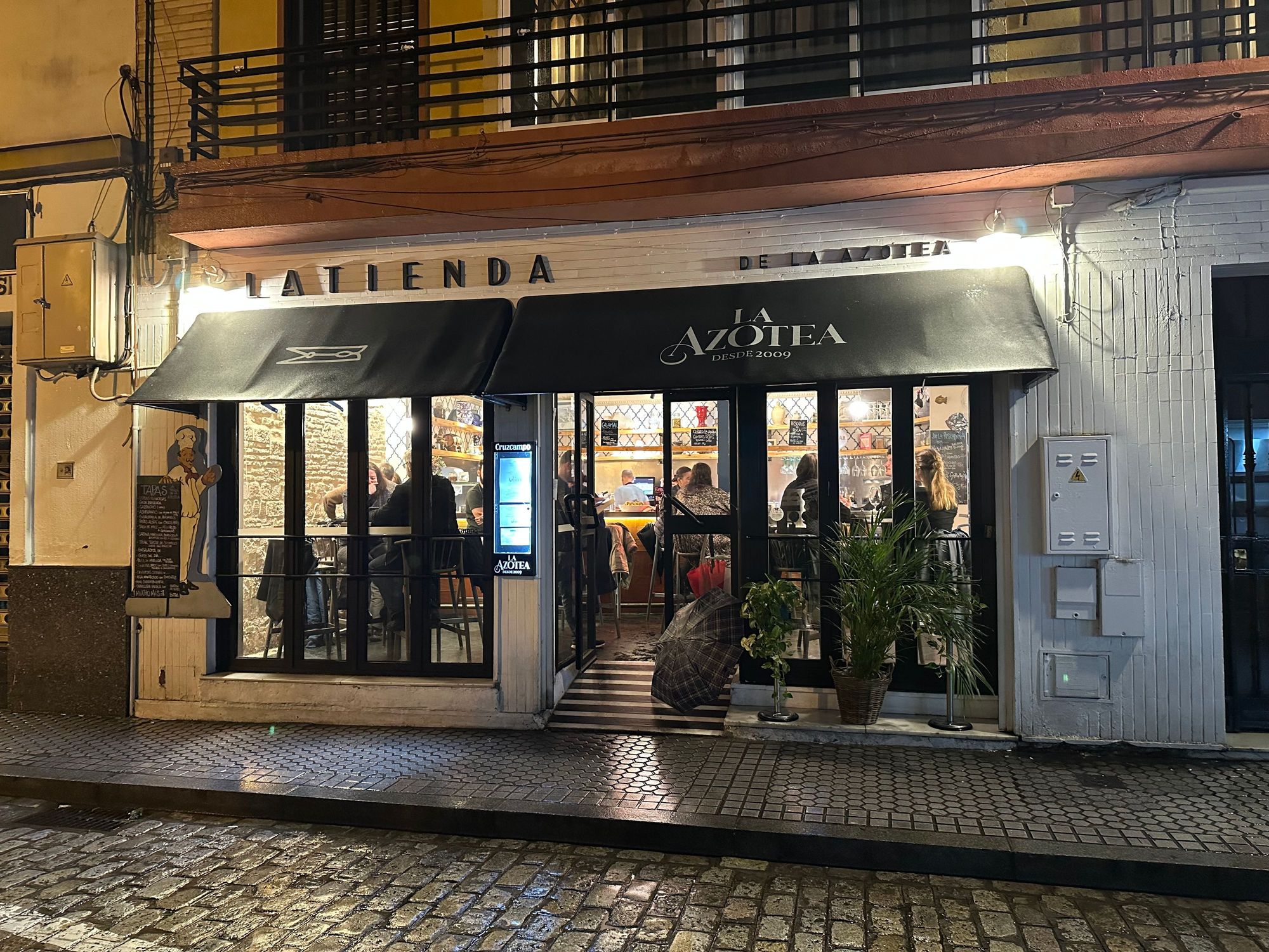 Exterior of AZOTEA TIENDA on this rainy night in March