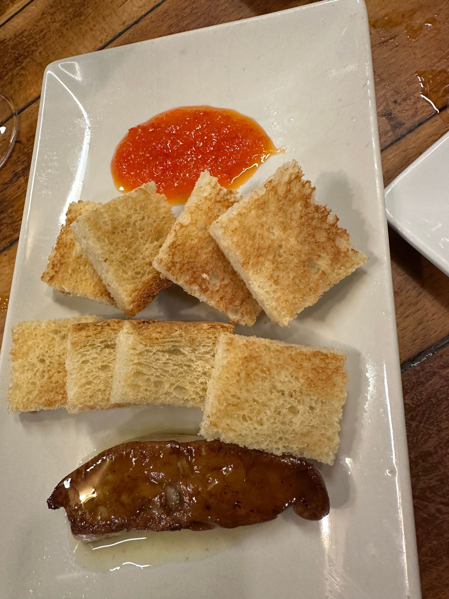 An ideal pairing with a Pedro Jimenez sherry: Foie gras with a red pepper jam and toast points....among the many, many "must orders" at Casa Morales, Sevilla