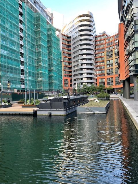 Behind the Paddington Station and St. Mary's Hospital is the Paddington Basin, once and still a canal, but now they are building really upscale building and apartments along the canal.