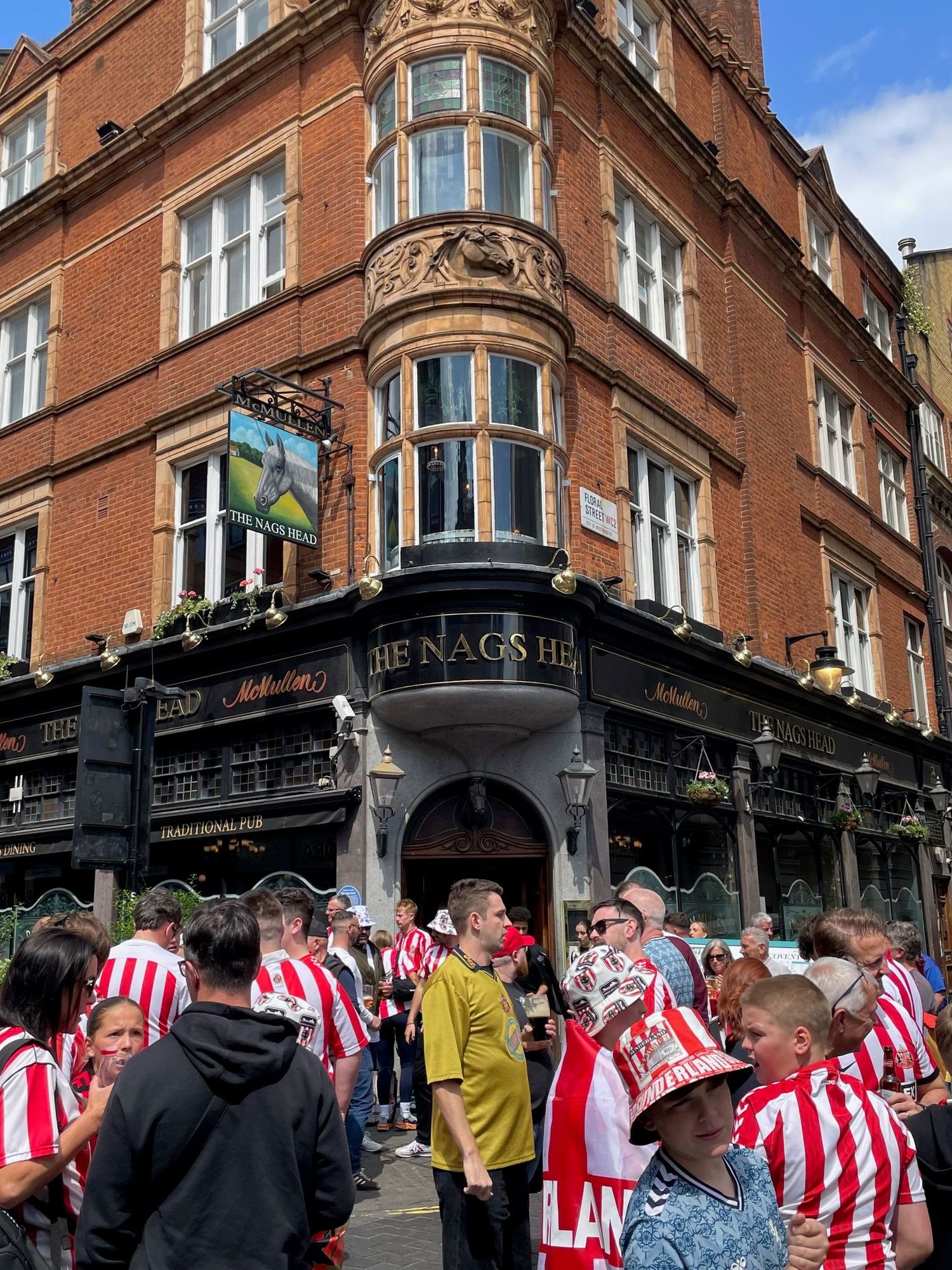 Walked past this pub and a soccer riot was going on, riot of fun that is, all of these guys were blocking the streets singin
