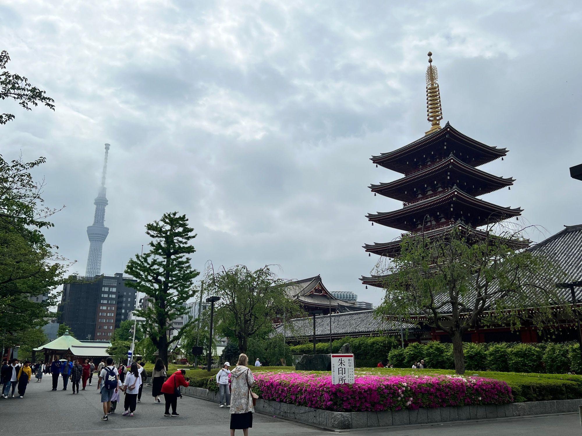 Five story pagoda contrasts with Tokyo Skytree in the background.