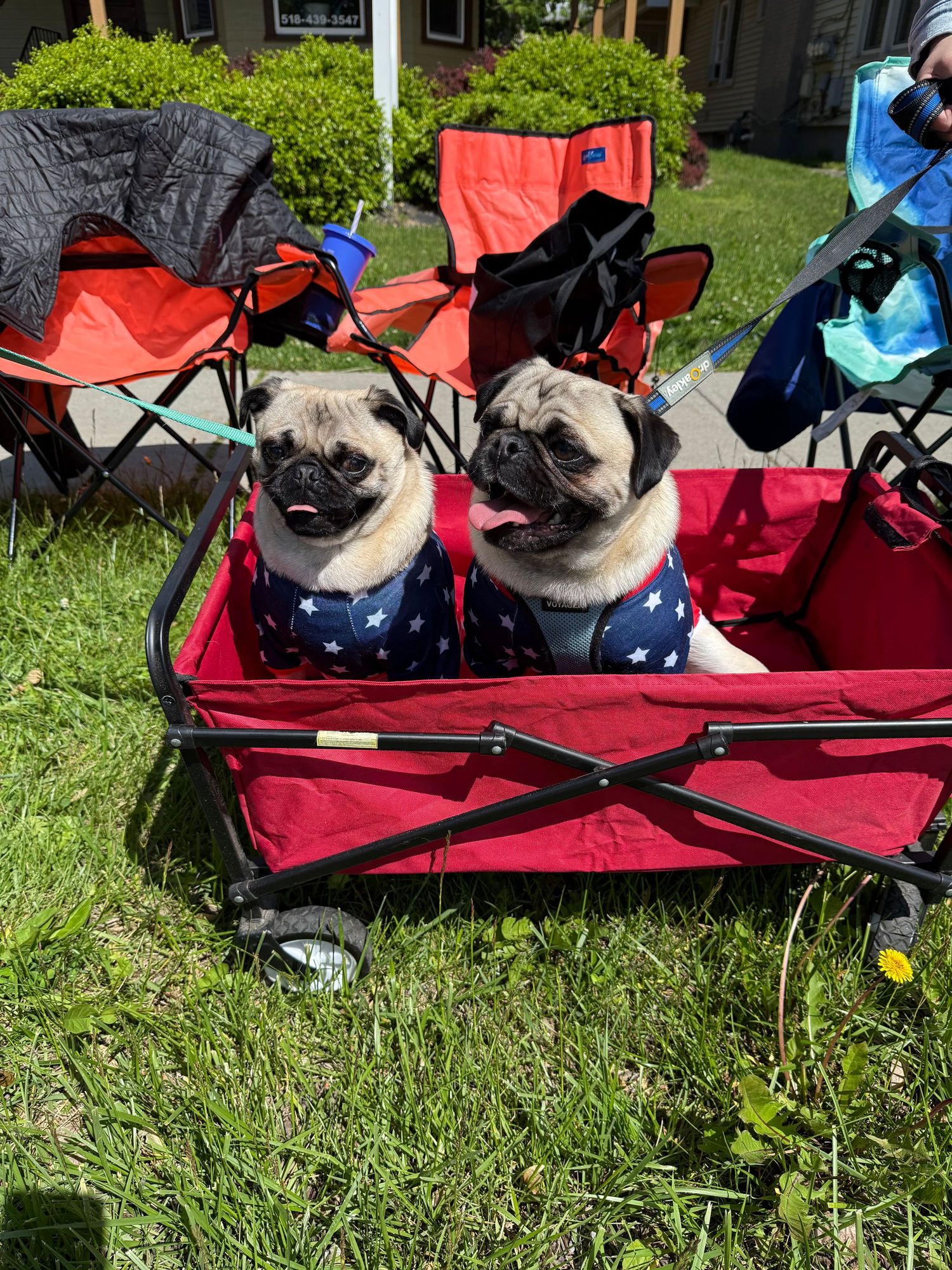 Our grand pup Clover (left) and her brother Lucky at the Memorial Day parade today.