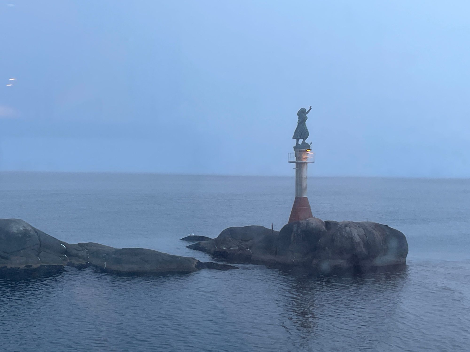 Fiskarkona,-The fisherman's wife, was made by the sculptor Per Ung (1933 – 2013) and stands at the far end of the breakwater at the entrance to Svolvær.