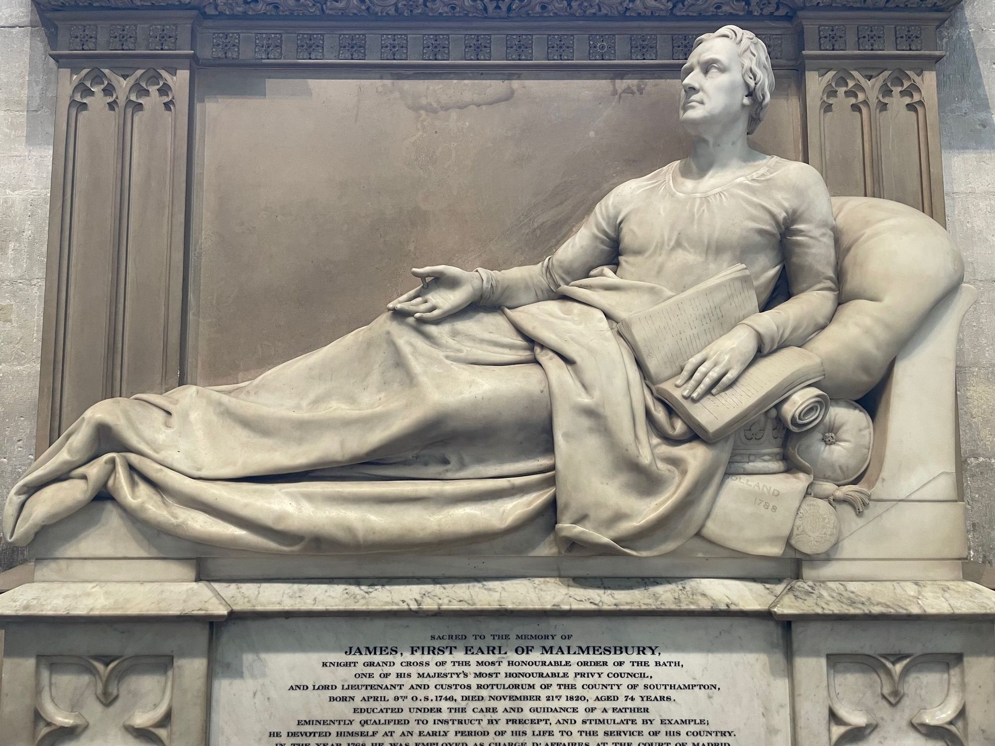 This guy, James, First Earl of Malmesbury, is probably in an above ground tomb. This cat had so much money he actually had a giant marble sculpture of him, lying in his den. I think he's asking Mrs Malmesbury to give him the remote.