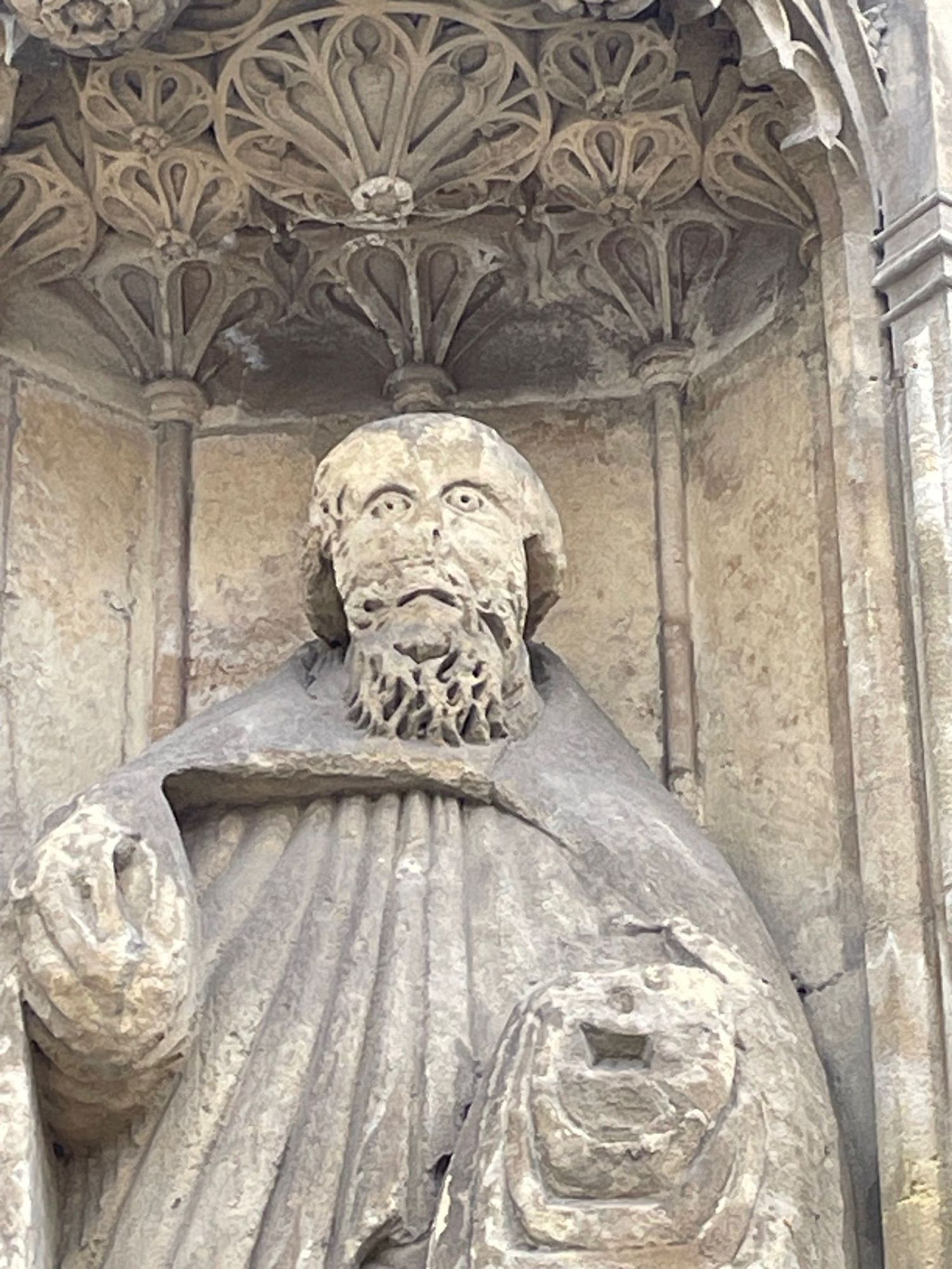 This is easier to explain than to see from this picture. This is a statue of Peter. After Henry the VIII got rid of the Church, someone vandalized Peter's head. So this head, has actually been carved out of what was left of his beard. That's why the wierd face.