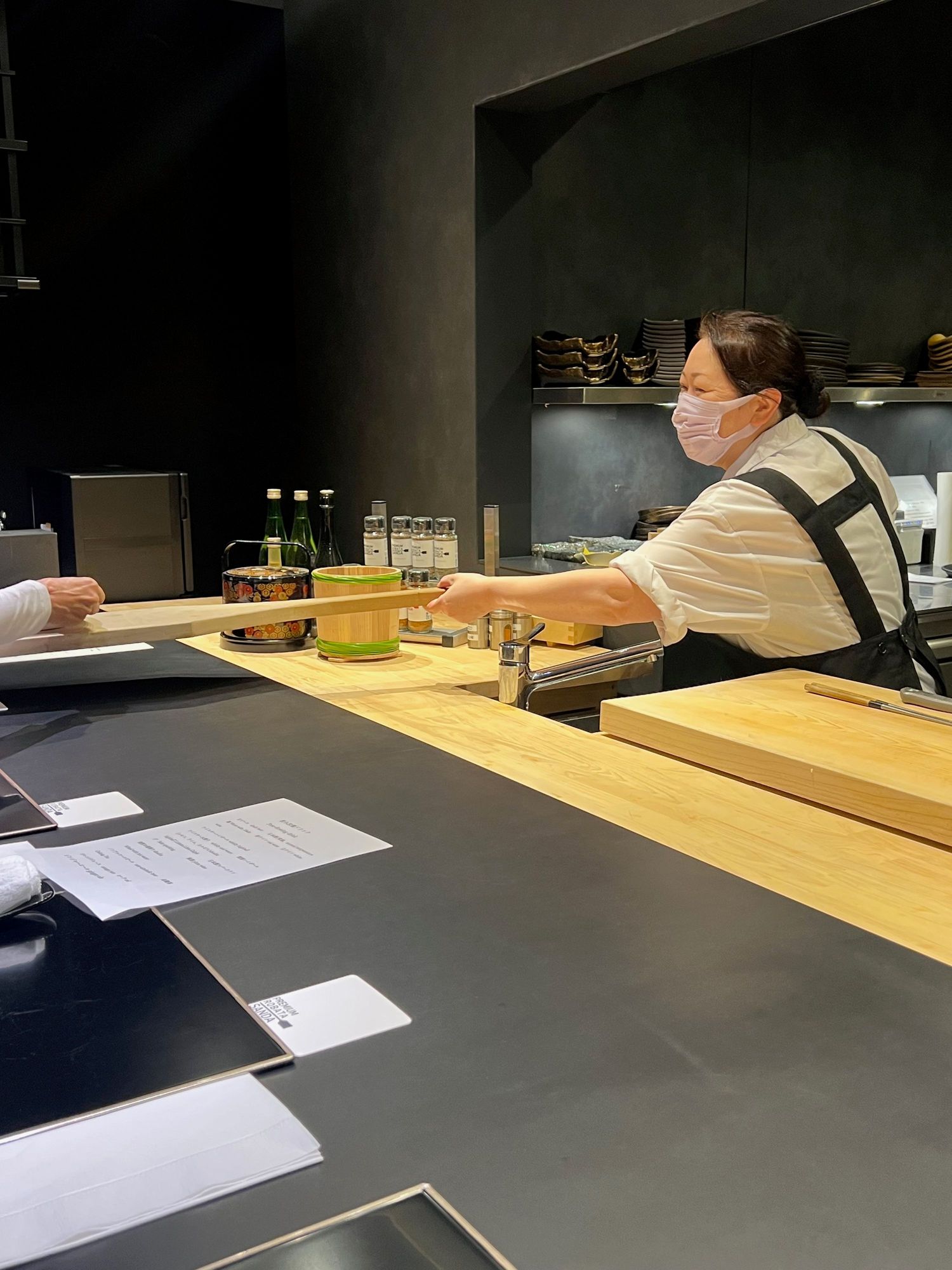 Clever solution to allow safe delivery of each dish across the wide countertop.