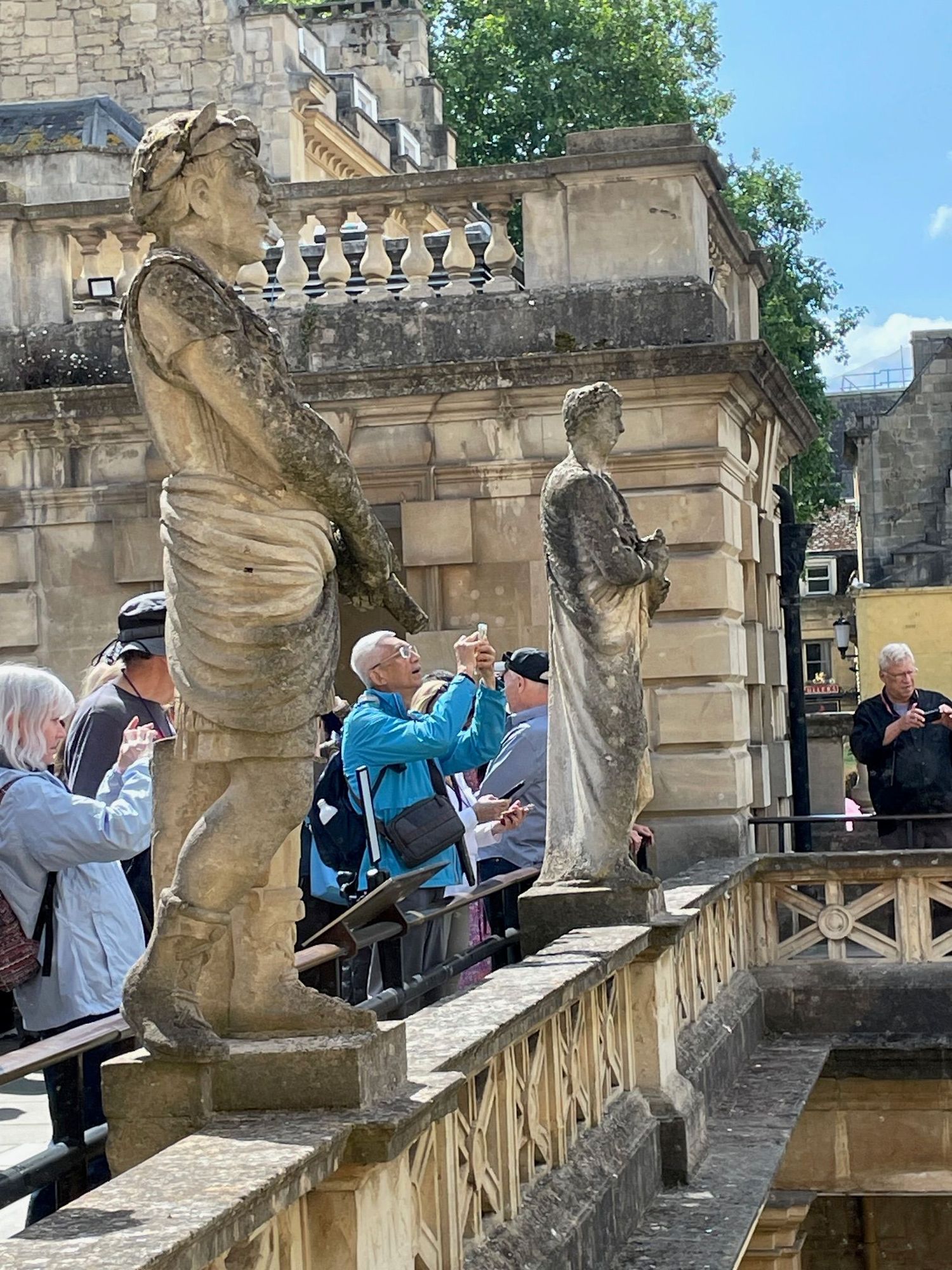 This "patio" is above the old Roman bath. It is not that old, the statues were done sometime in the 1890's.