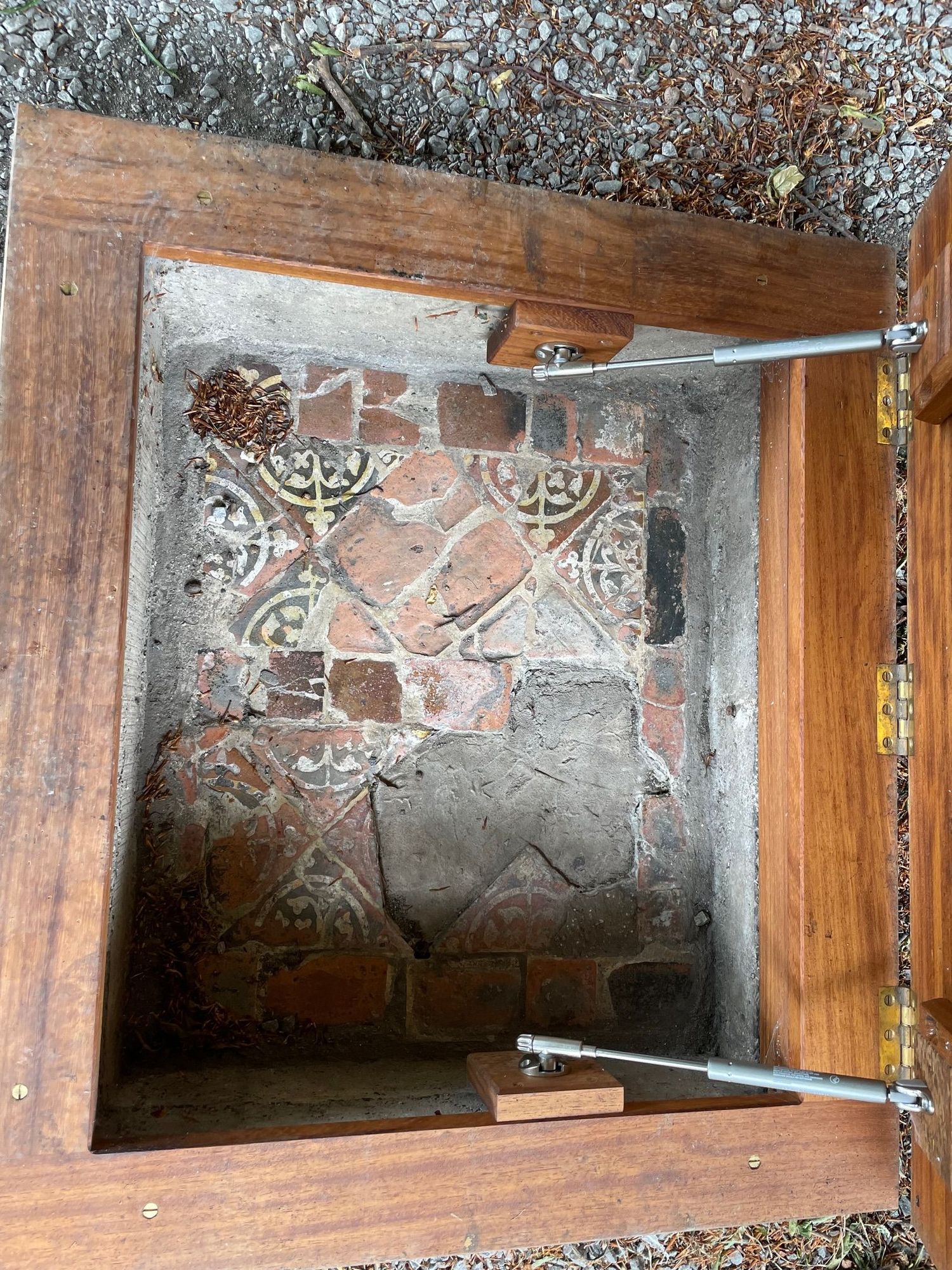 As you walk along you come upon two or three little doors in the grass. When opened you can see some of the original floor