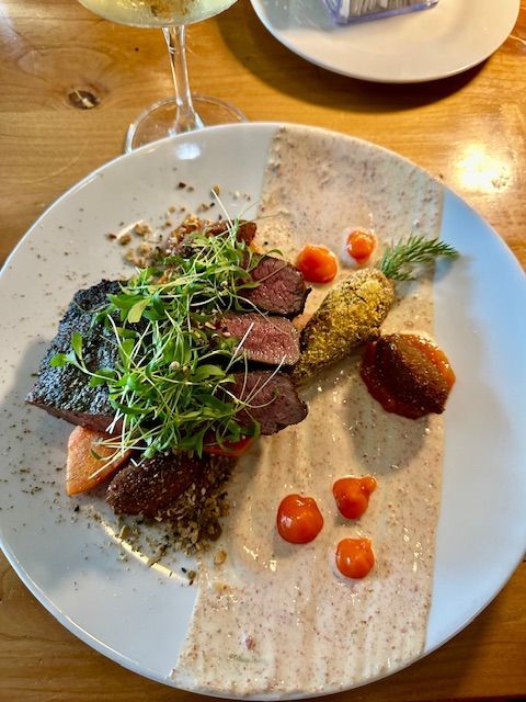African flavored lamb with red lentil croquettes, apricot marmalade, carrots and a yogurt spiced sauce.
